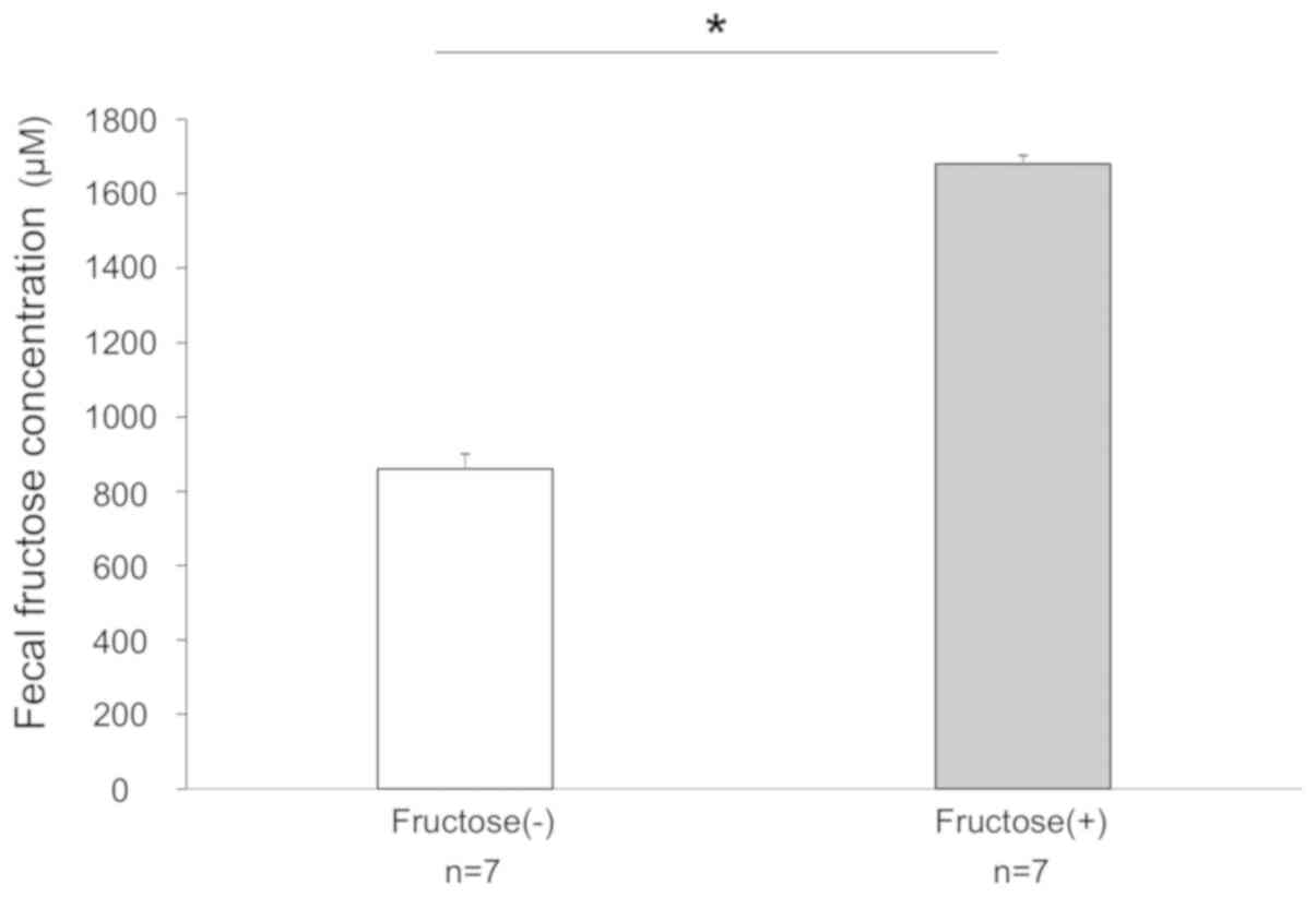 Fructose is an inverted sugar that is used in popular carbonated beverages (7-9). It is absorbed from the intestinal lumen by diffusion, a process that is facilitated by the mucosal GLUT5 transporter protein, a type of glucose-dependent transporter (10). Previous studies demonstrated that increased fructose consumption resulted in the accumulation of lipids in the liver, leading to elevated plasma triglyceride levels and oxidative stress (11-13). Therefore, the excessive intake of fructose is considered a risk factor for lifestyle-related diseases, including obesity, type 2 diabetes mellitus and non-alcoholic fatty liver disease (14-17). It was reported that chronic fructose intake in mice was associated with the loss of occludin in the small intestine, and that gut bacterial overgrowth was associated with the translocation of bacterial endotoxins from the intestine to the liver (18,19).