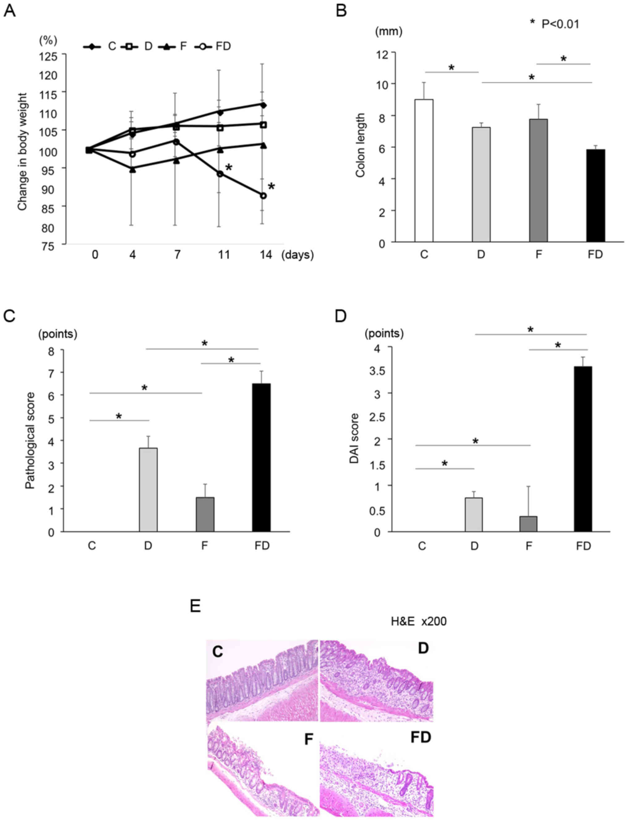 No significant difference in the rates of body weight change were found among Groups C, D and F; however, the rate of body weight change in Group F tended to be lower compared with those in Groups C and D. The rate of body weight change in Group FD was significantly decreased compared with that in the other groups on day 14 (Fig. 2A). The colon length in Group FD was significantly shorter than in the other groups (Fig. 2B). In addition, the pathological and DAI scores of Group FD were significantly increased compared with those of Groups C, D and F; furthermore, the scores of Group F were significantly increased compared with those of Group C (Fig. 2C and D). On pathological examination of the colon, mild inflammatory cell infiltration was observed in the mucosal layer, whereas the epithelial cells were normal in Group F. In Group FD, the mucosa was broken by erosion or ulcers, and infiltration of inflammatory cells into the submucosal layer was observed (Fig. 2E).