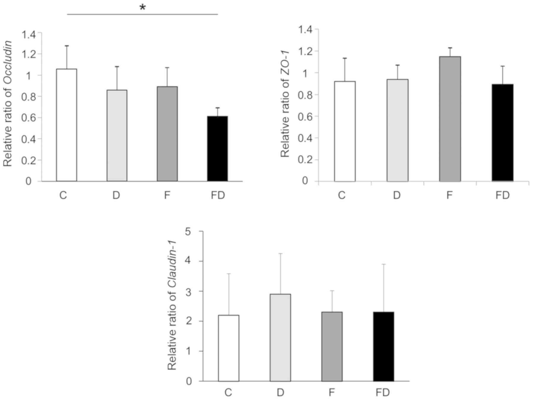 The expression of occludin in Group F was decreased compared with that in Group C. The expression of occludin in Group FD was significantly decreased compared with that in Group C. Otherwise, the expression levels of ZO-1 and claudin-1 in the large intestine of these groups did not differ to a statistically significant extent (Fig. 4).