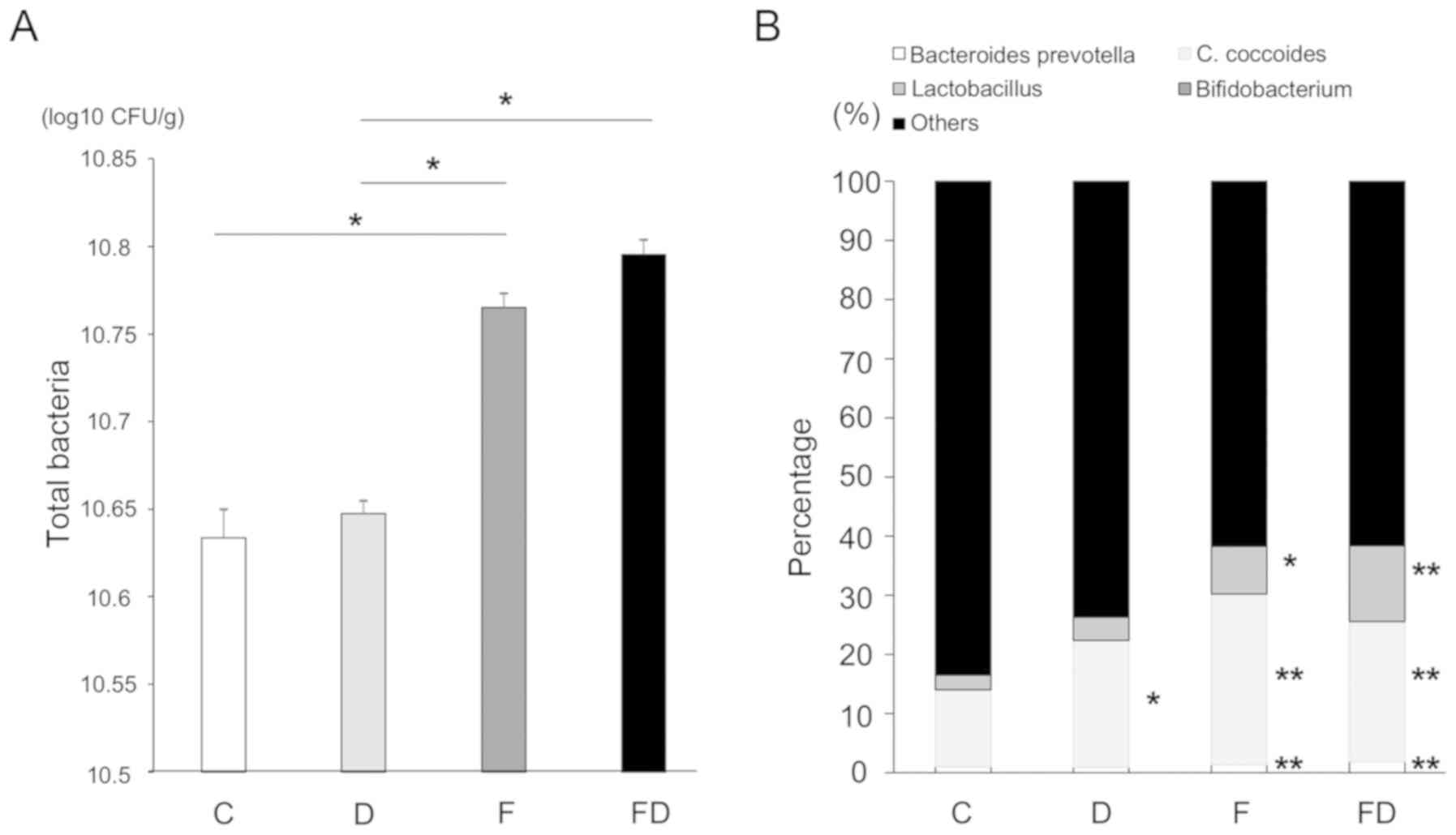 The numbers of intestinal bacteria, including the Lactobacillus group, Bifidobacterium group, C. coccoides group and Bacteroides-Prevotella in each of the groups were measured. The total numbers of bacteria in the colon of Group F and FD were increased compared with those of Groups C and D. The total counts in each group were as follows: Group C, 4.3×1010 CFU/ml; Group D, 4.4×1010 CFU/ml; Group F, 5.8×1010 CFU/ml; and Group FD, 6.2×1010 CFU/ml (Fig. 5A). The counts (and percentages) of Bacteroides-Prevotella in the four groups were as follows: Group C, 2.3×108 CFU/ml (1.02%); Group D, 2.2×108 CFU/ml (0.93%); Group F, 6.1×108 CFU/ml (1.59%); and Group FD, 6.2×108 CFU/ml (1.90%). The counts of C. coccoides were as follows: Group C, 3.0×109 CFU/ml (13.0%); Group D, 5.2×109 CFU/ml (21.48%); Group F, 1.1×1010 CFU/ml (28.9%); and Group FD, 7.7×109 CFU/ml (23.72%). The counts of the Lactobacillus group were as follows: Group C, 5.7×108 CFU/ml (2.5%); Group D, 9.6×108 CFU/ml (3.9%); Group F, 3.0×109 CFU/ml (7.9%); and Group FD, 4.1×109 CFU/ml (12.7%). Finally, the counts of the Bifidobacterium group were as follows: Group C, 2.0×107 (0.08%); Group D, 1.0×107 (0.04%); Group F, 4.1×107 (0.1%); and Group FD, 4.9×107 (0.15%). Excessive fructose intake affected the numbers and percentages of the Bacteroides-Prevotella group, C. coccoides, the Lactobacillus group and the Bifidobacterium group (Fig. 5B).