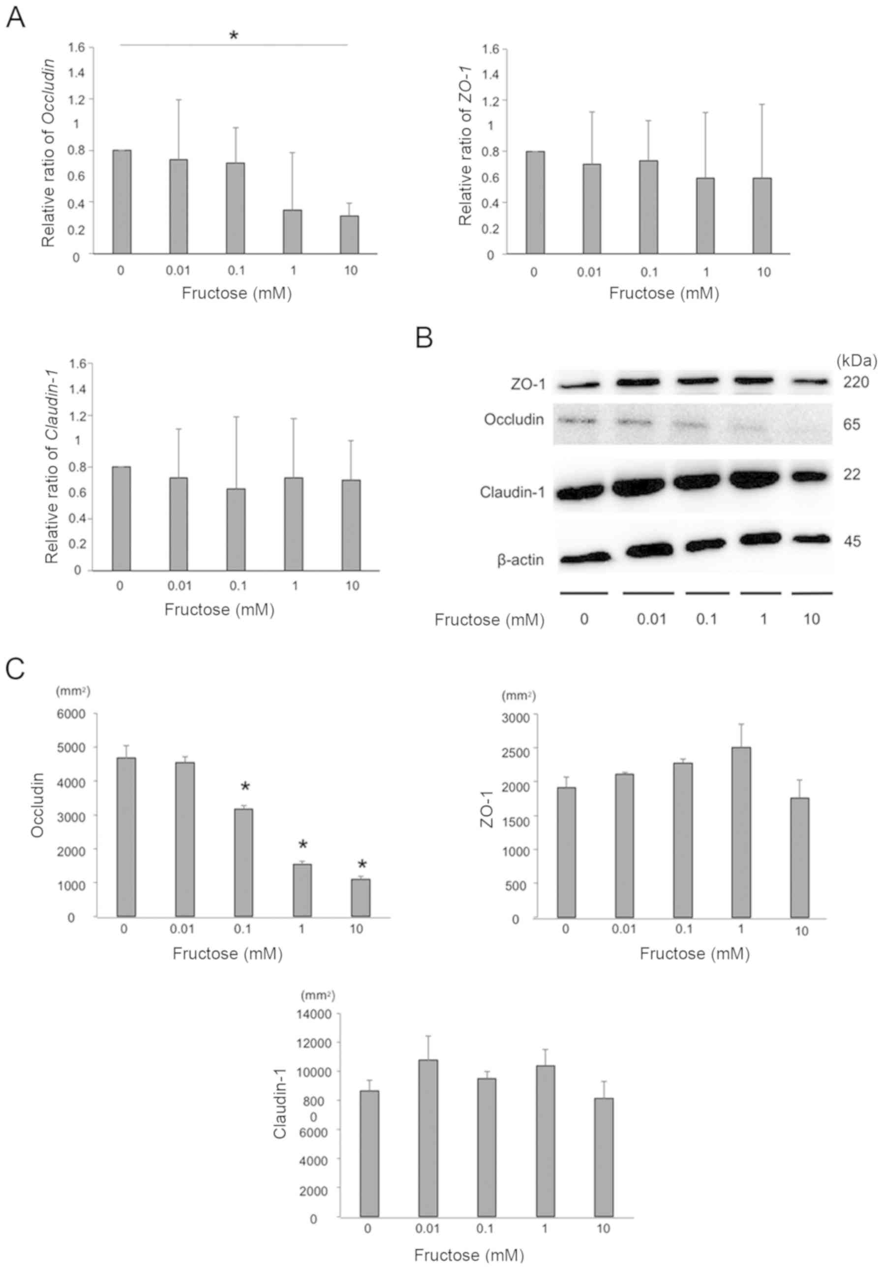 The gene expression levels of occludin, ZO-1 and claudin-1 of HT-29 cells following exposure to several concentrations of fructose were measured using RT-qPCR analysis, and the gene expression of occludin was significantly decreased by fructose exposure in a dose-dependent manner. The gene expression of ZO-1 and claudin-1 did not differ in vitro (Fig. 6A). The expression of tight junction proteins was also examined by western blotting. The expression of occludin in HT-29 cells was significantly decreased by fructose exposure in a dose-dependent manner, whereas no differences in the expression ZO-1 or claudin-1 were observed (Fig. 6B and C).