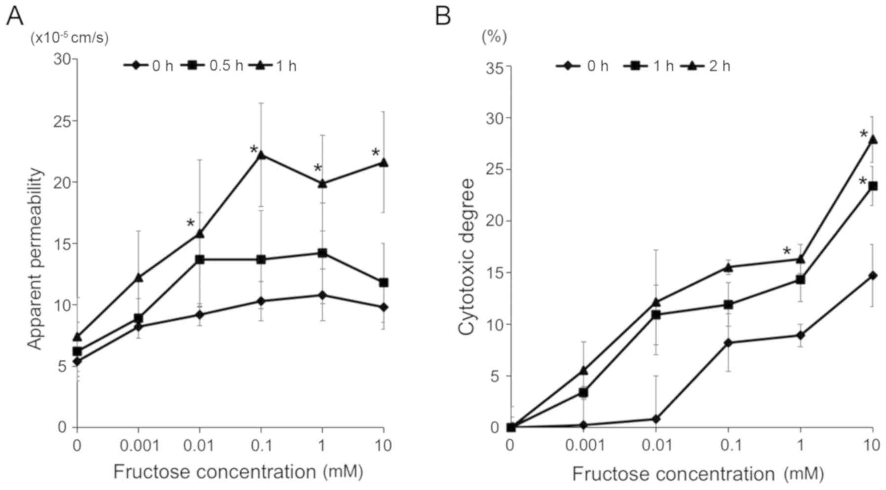 The epithelial permeability to macromolecules was determined using fluorescein isothiocyanate (FITC)-dextran. The 1.5×105 cells/well of HT-29 cells were seeded on the upper chamber with 8-µm pores and cultured until they reached full confluence in monolayers. The cells in the upper chamber were exposed to fructose (0.001, 0.01, 0.1, 1 or 10 mM) and then incubated with FITC-dextran (5 mg/ml) for 24 h at 37°C in a CO2 incubator. The fluorescence of FITC-dextran in the lower chambers was sequentially measured following exposure to fructose (0, 0.5 and 1 h) 24 h at 37°C in a CO2 incubator. The data were calculated as follows: Apparent permeability (cm/s) = (rate of change in cumulative mass of FITC transferred to lower chamber)/[(surface area of cell culture insert) × (initial concentrations of radio-labeled substances)] (24). This assay was conducted five times.