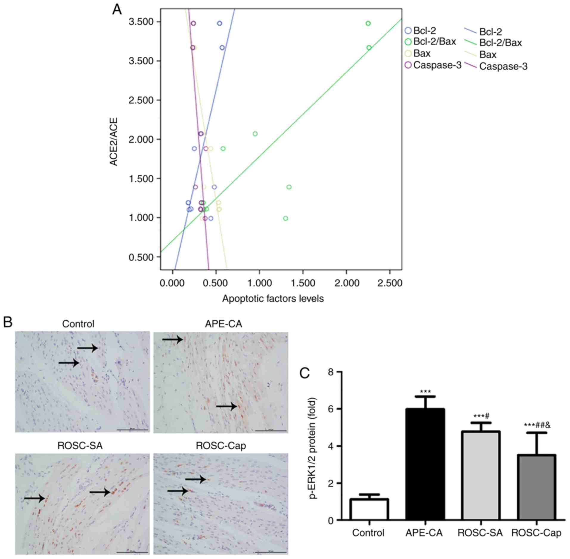 In the present study, the ACE2/ACE ratio was positively correlated with the levels of Bcl-2 (r=0.792, P<0.01) and the Bcl-2/Bax ratio (r=0.884, P<0.001), and negatively correlated with the levels Bax (r=−0.844, P<0.01) and caspase-3 (r=−0.789, P<0.01) in the control, APE-CA and ROSC-SA groups (Fig. 6A). These results support the hypothesis that an imbalance in the ACE2/ACE axis affects apoptosis of the left myocardium during APE-CA.