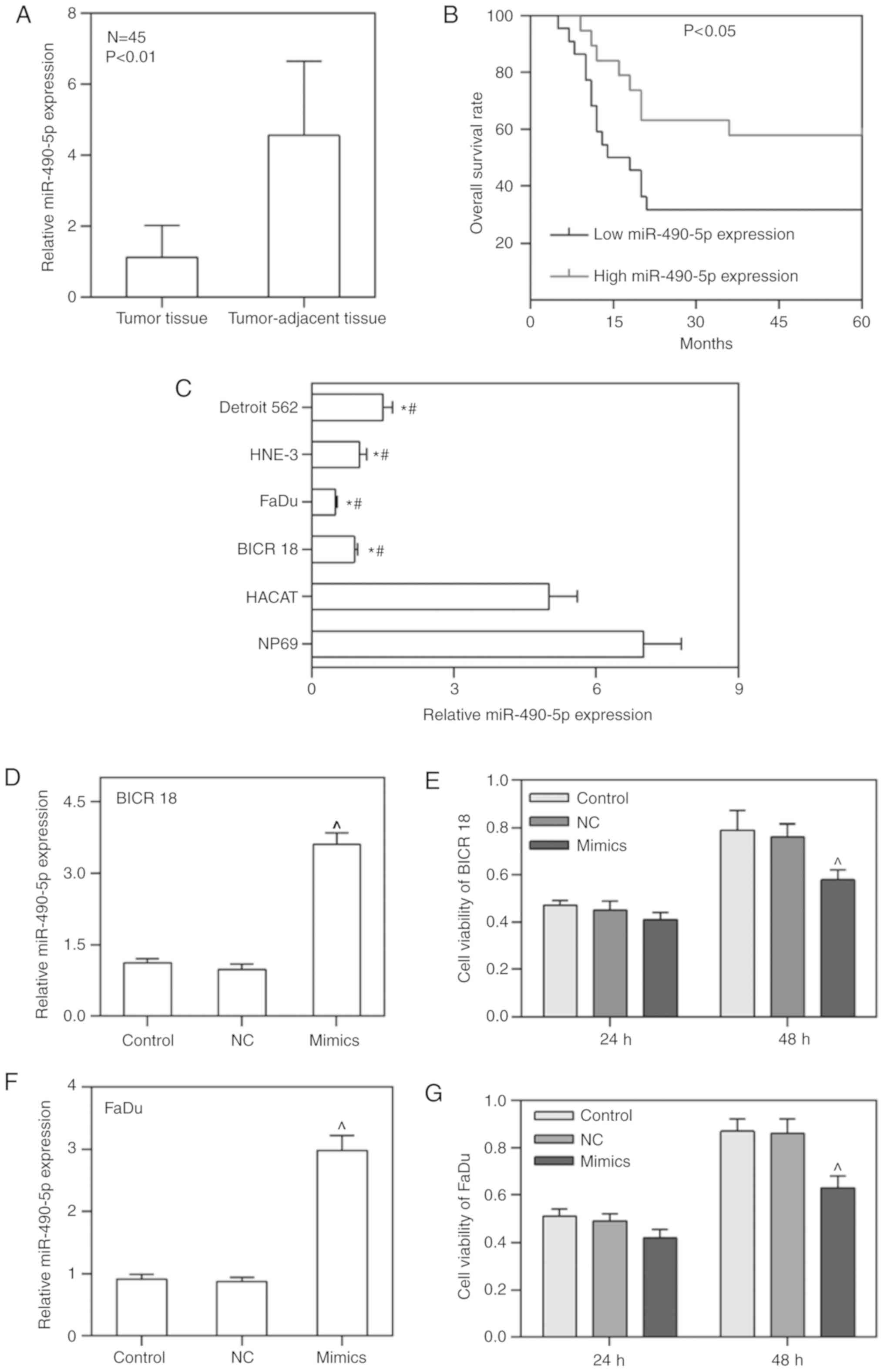Tumor and tumor-adjacent tissues samples of 45 patients with laryngeal carcinoma admitted to the People's Hospital of Xinjiang Uygur Autonomous Region (Xinjiang, China) from February 2009 to October 2013 were selected. These patients including 41 males and 4 females, the age of these patients ranged from 42-76 years old, with an average of 59.6±7.9 years. The data of overall survival (OS) rates of 45 cases were also collected from the hospital. The cut-off line of low and high expression of miR-490-5p were determined according to the median of its expression in these cases. The present study was approved by the Ethics Committee of the People's Hospital of Xinjiang Uygur Autonomous Region, and an informed consent was obtained from each patient.