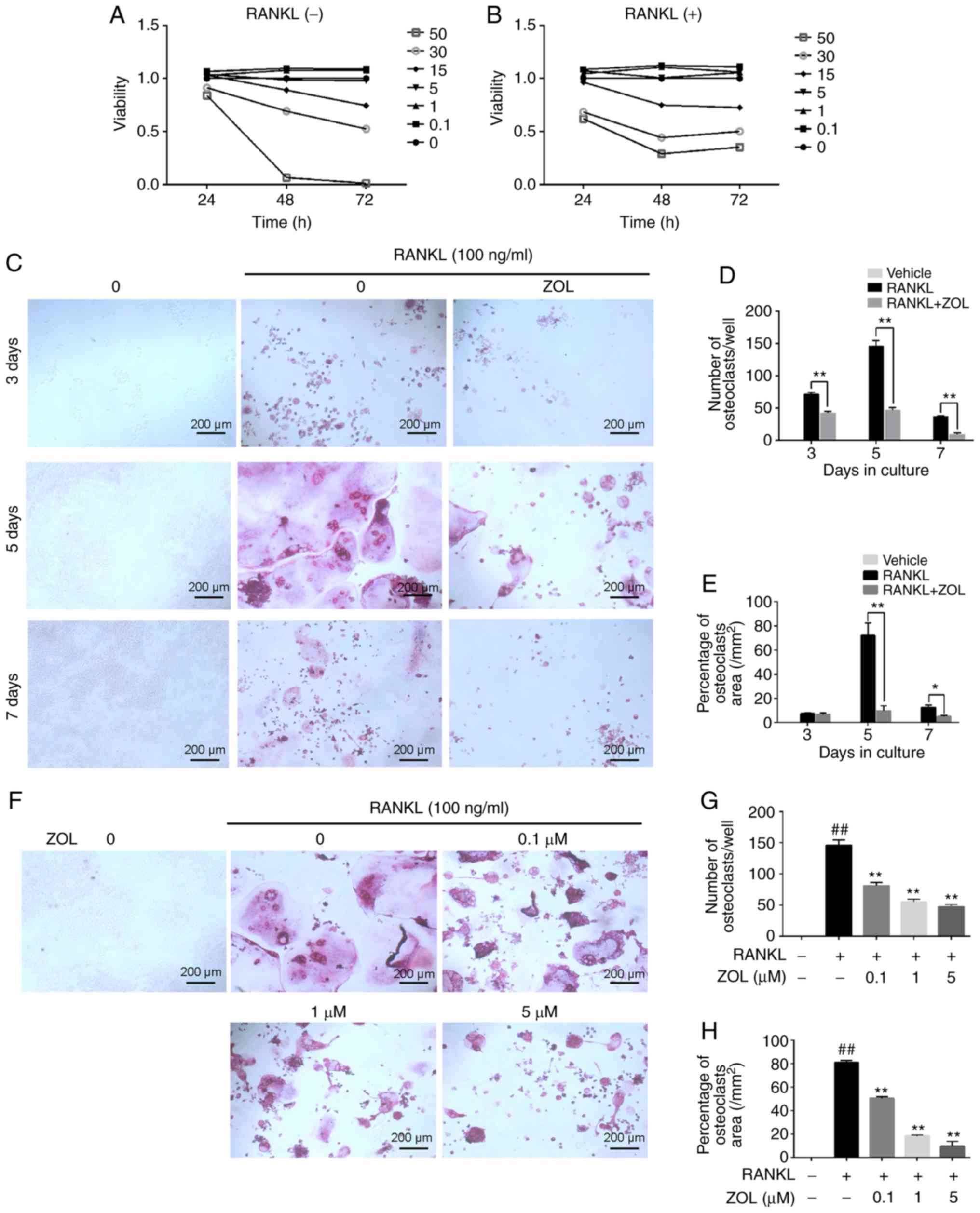 After excluding the possibility that the inhibitory effects of ZOL on TRAP activity were due to cytotoxicity at concentrations of up to 5 µM, the effects of ZOL on RANKL-induced osteoclastogenesis were assessed. In the RANKL group, the RAW264.7 cells exhibited characteristic morphological changes toward osteoclasts at day 3 of RANKL-induced differentiation, with increasing cell-cell fusion into large and multinucleate TRAP-positive osteoclast cells, reaching completion at day 5 (Fig. 2C). However, the number of osteoclasts (Fig. 2D) and percentage of the osteoclast area (Fig. 2E) was significantly suppressed by incubation with 1 µM ZOL for different periods of time (3, 5 and 7 days). Furthermore, ZOL suppressed osteoclastogenesis in a dose-dependent manner (Fig. 2F-H). Taken together, these results suggest that ZOL inhibits osteoclast formation.