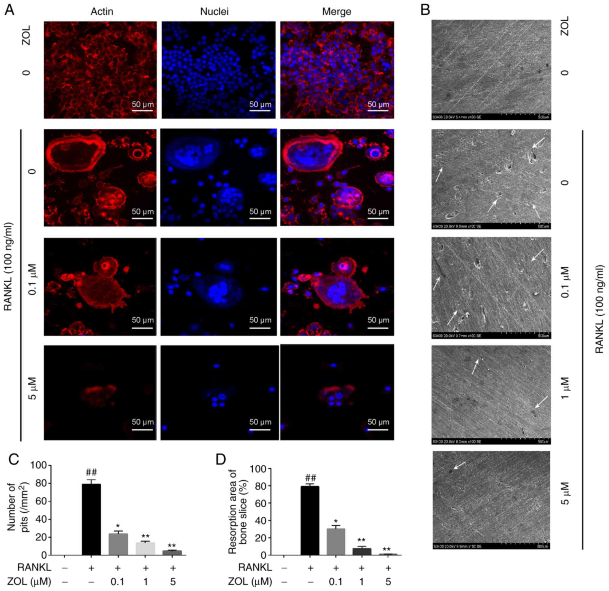 We then investigated whether ZOL modulates mature osteoclast activity by performing a resorption pit assay. RAW264.7 cells were plated on bone slices, which were treated with various concentrations of ZOL in the presence or absence of 100 ng/ml RANKL. The results indicated that the area of osteoclast bone resorption pits was markedly decreased by ZOL in a dose-dependent manner compared with the ZOL-free group. Furthermore, almost no resorption pits were observed in the groups treated with 5 µM ZOL (Fig. 3B-D). These results suggested that treatment with ZOL markedly attenuates the bone-resorption activity of osteoclasts. This may, at least partially, be explained by the effect of ZOL to impair osteoclastogenesis.