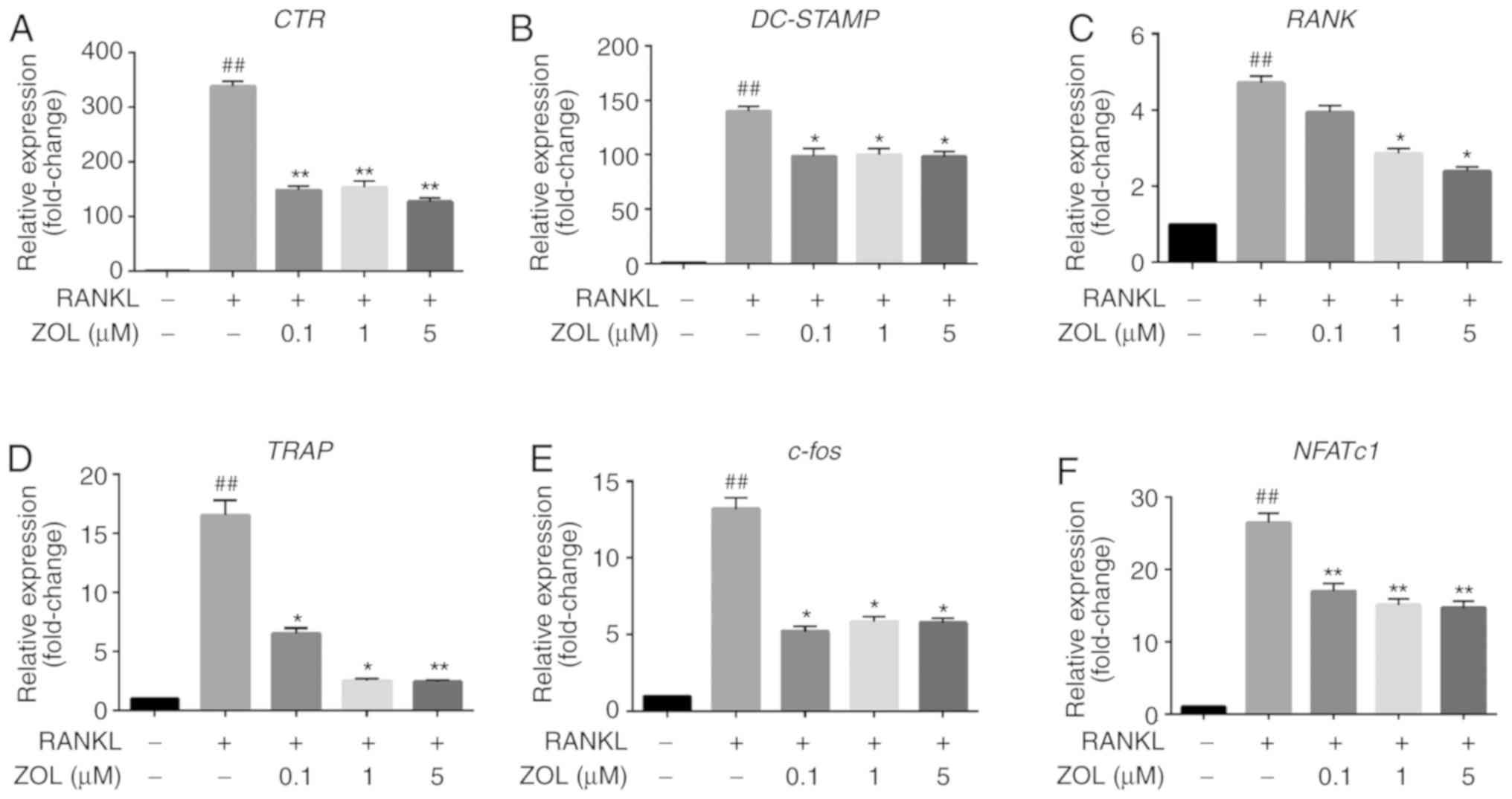 To further elucidate the effects of ZOL on osteoclast formation and resorptive function, the expression of specific osteoclast differentiation-associated genes in ZOL-treated cells was assessed by RT-qPCR. It was indicated that treatment with RANKL markedly increased the expression levels of CTR, RANK, TRAP, DC-STAMP, NFATc1 and c-Fos. However, this upregulation was significantly suppressed by ZOL in a dose-dependent manner during osteoclastogenesis compared with that in the ZOL-free group (Fig. 4). These results suggest that ZOL inhibits the expression of RANKL-induced genes involved in osteoclast differentiation and function.