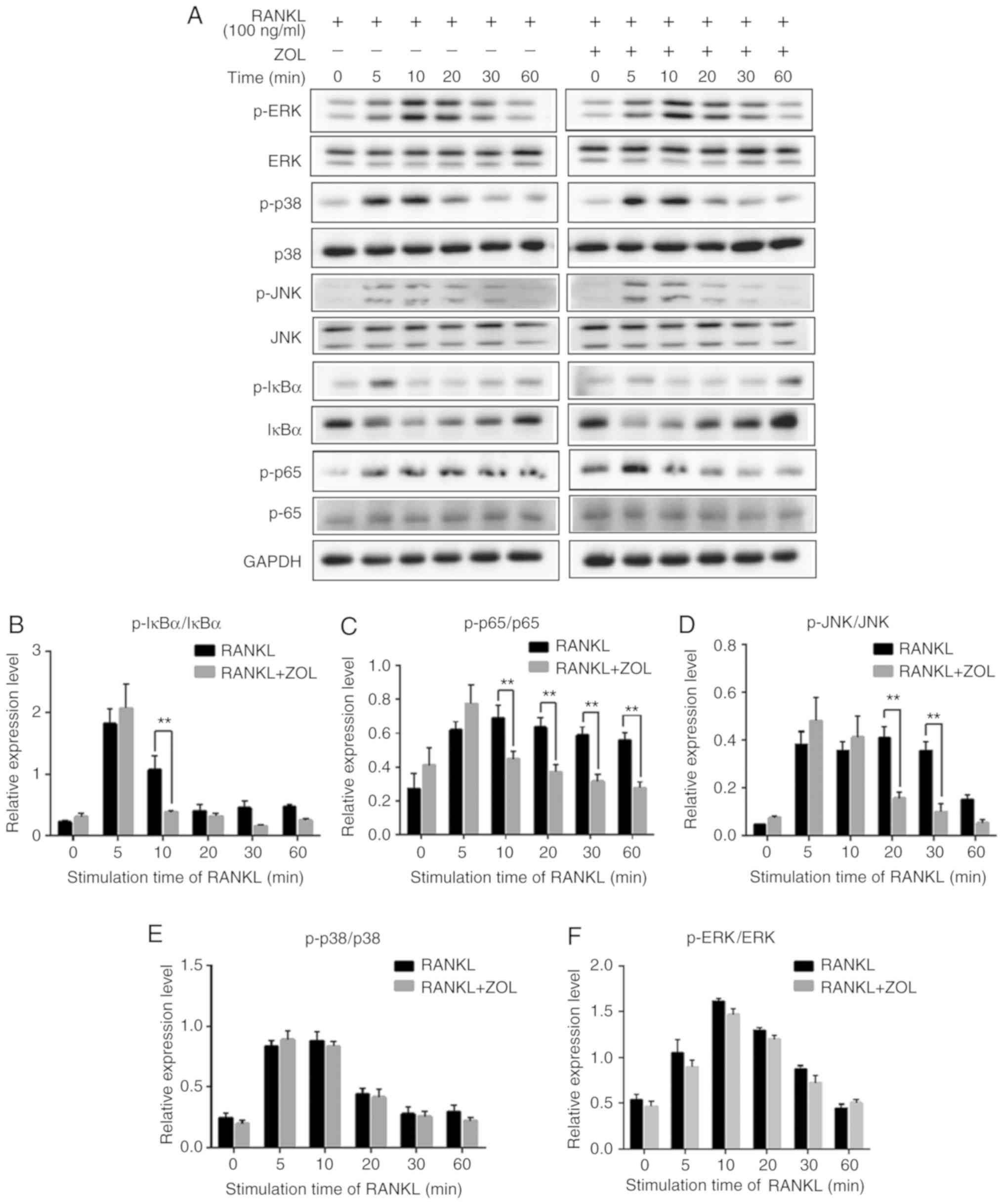 To further examine the influence of ZOL on NF-κB and MAPK mediated osteoclast differentiation, the intensity of each phosphorylated protein was divided by the intensity of corresponding total protein in both RANKL and RANKL+ZOL treated groups. The results revealed that ZOL significant inhibited RANKL-dependent phosphorylation of IκBα (Fig. 5B) and p65 (Fig. 5C). Among the MAPK family proteins, the phosphorylation of JNK (Fig. 5D) was significantly inhibited by ZOL. However, the phosphorylation of p38 and ERK proteins were not significantly affected by ZOL (Fig. 5E and F). Thus, these results indicate that ZOL may inhibit NF-κB and JNK signalling by reducing the levels of p-IκBα, p-p65 and p-JNK. In other words, ZOL may reduce the formation of osteoclasts by suppressing the RANKL-induced activation of the NF-κB and JNK signalling pathways.