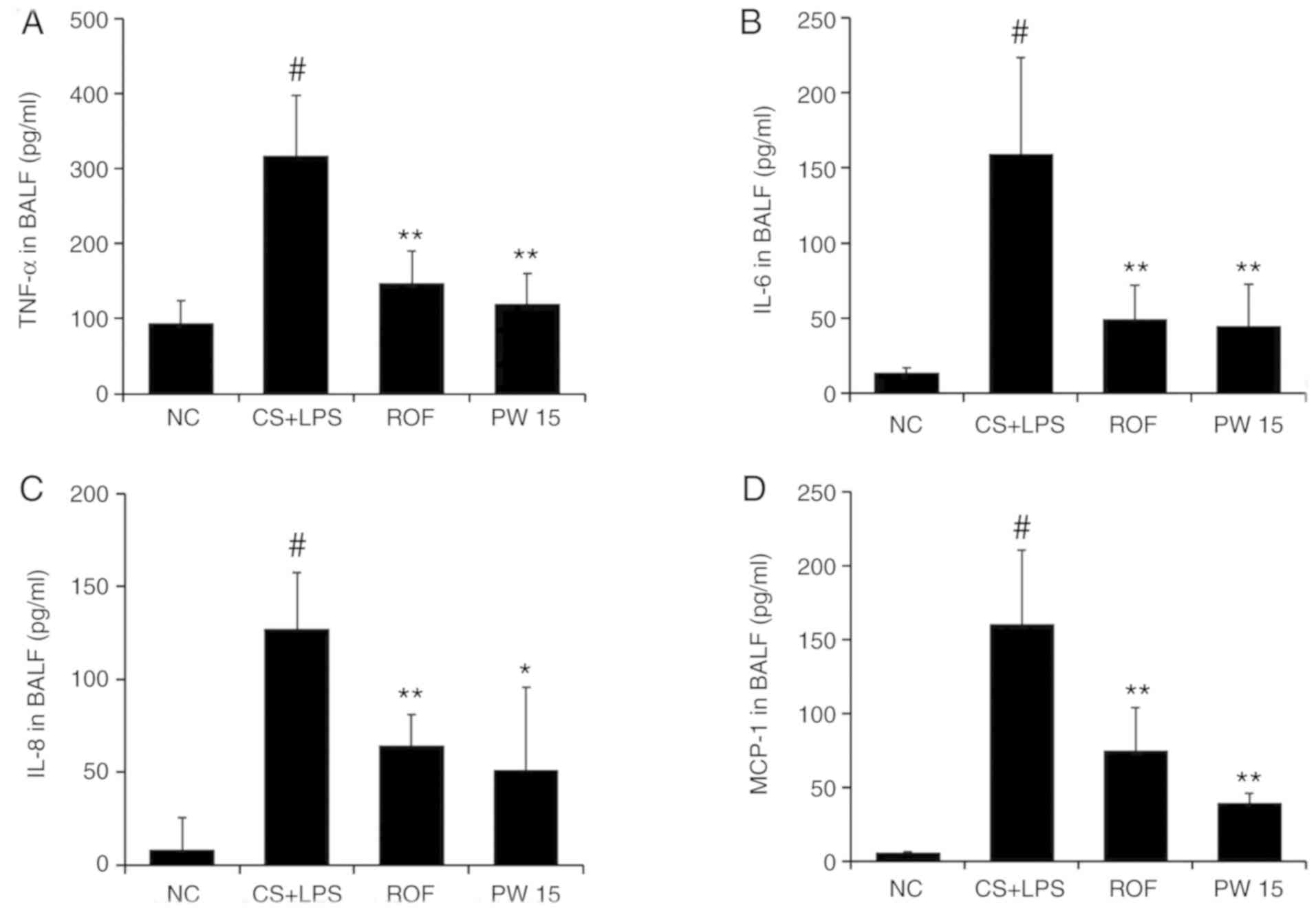The concentration of inflammatory molecules in the BALF was measured by ELISA. As presented in Fig. 5, the levels of TNF-α, IL-6, IL-8 and MCP-1 were significantly higher in the CS+LPS group compared with the NC group, whereas a significant reduction of these molecules was detected in the PWRE-treated group (Fig. 5A-D). Compared with the CS+LPS group, the inhibition levels of ROF against the inflammatory molecules were 53.50 (TNF-α), 68.98 (IL-6), 49.46 (IL-8) and 53.61% (MCP-1; P<0.01), while for PWRE, they were 62.21 (TNF-α), 72.09 (IL-6), 49.46 (IL-8) and 75.53% (MCP-1; P<0.05).