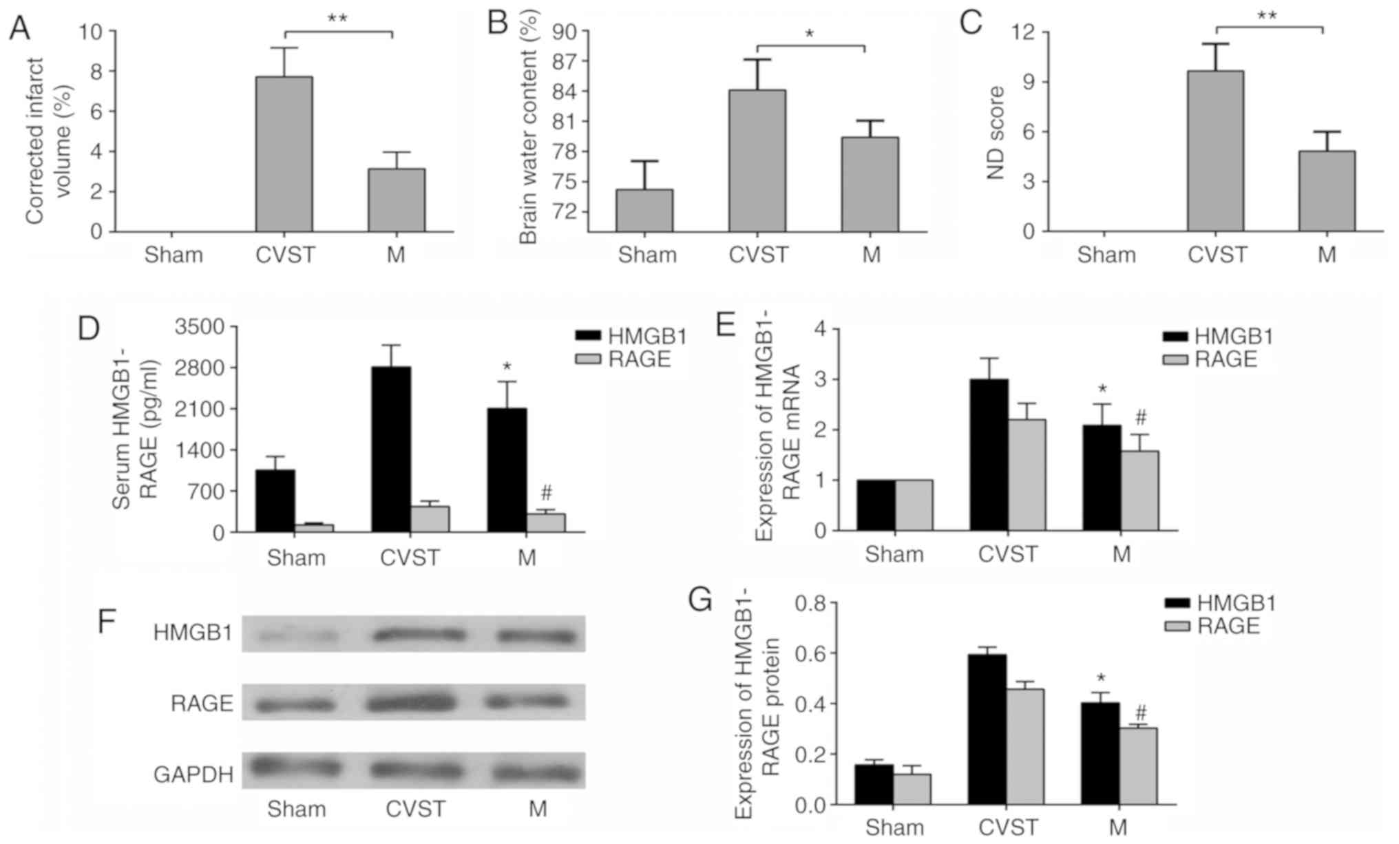 Coronal sectioning was performed ~2 mm to the left and right of the SSS. Subsequently, a cut was made along the upper edge of the hippocampus. The outer cortex was the penumbra and the medial cortex was the infarction core region. Total RNAs were isolated from the penumbra of the infarct hemisphere using TRIzol reagent (Invitrogen; Thermo Fisher Scientific Inc. Waltham, MA, USA) according to the manufacturer's instructions, and total RNAs were then reverse transcribed into cDNA using the High-Capacity cDNA RT kit (Roche Diagnostics GmbH, Mannheim, Germany) at 37°C for 15 min. The mRNA expression levels of HMGB1 and RAGE were analyzed by qPCR using the SYBR Green PCR Master Mix kit (Applied Biosystems; Thermo Fisher Scientific Inc.) and the ABI-Prism 7300 system (Applied Biosystems; Thermo Fisher Scientific Inc.). The thermal cycling parameters were as follows: Heat-activated enzyme was activated by heating at 95°C for 10 min, followed by 40 cycles of heating at 95°C for 15 sec to denature, heating to 60°C for 30 sec to anneal, and final elongation at 72°C for 30 sec. The concentration of the target genes was calculated by comparing the quantitative cycle (Cq) value in each sample with the Cq value of the internal standard curve using the 2−ΔΔCq method (16). Melting-curve analysis and gel-electrophoresis evaluation of the RT-qPCR products were routinely performed to determine reaction specificity. GAPDH mRNA was set as an internal reference to quantify the level of targeted mRNA. The following primers were used: GAPDH, forward 5′-AGC AGG CTG ACA GTG GAG TT-3′, and reverse 5′-AGC AGG CTG ACA GTG GAG TT-3′; RAGE, forward 5′-CGA GTC CGT GTC TAC CAG ATT-3′ and reverse 5′-GCG GCT GGA ATG GAA ACT GAA-3′; and HMGB1, forward 5′-GCT CCA TAG AGA CAG CGC CGG G-3′ and reverse 5′-CCT CAG CGA GGC ACA GAG TCG C-3′.