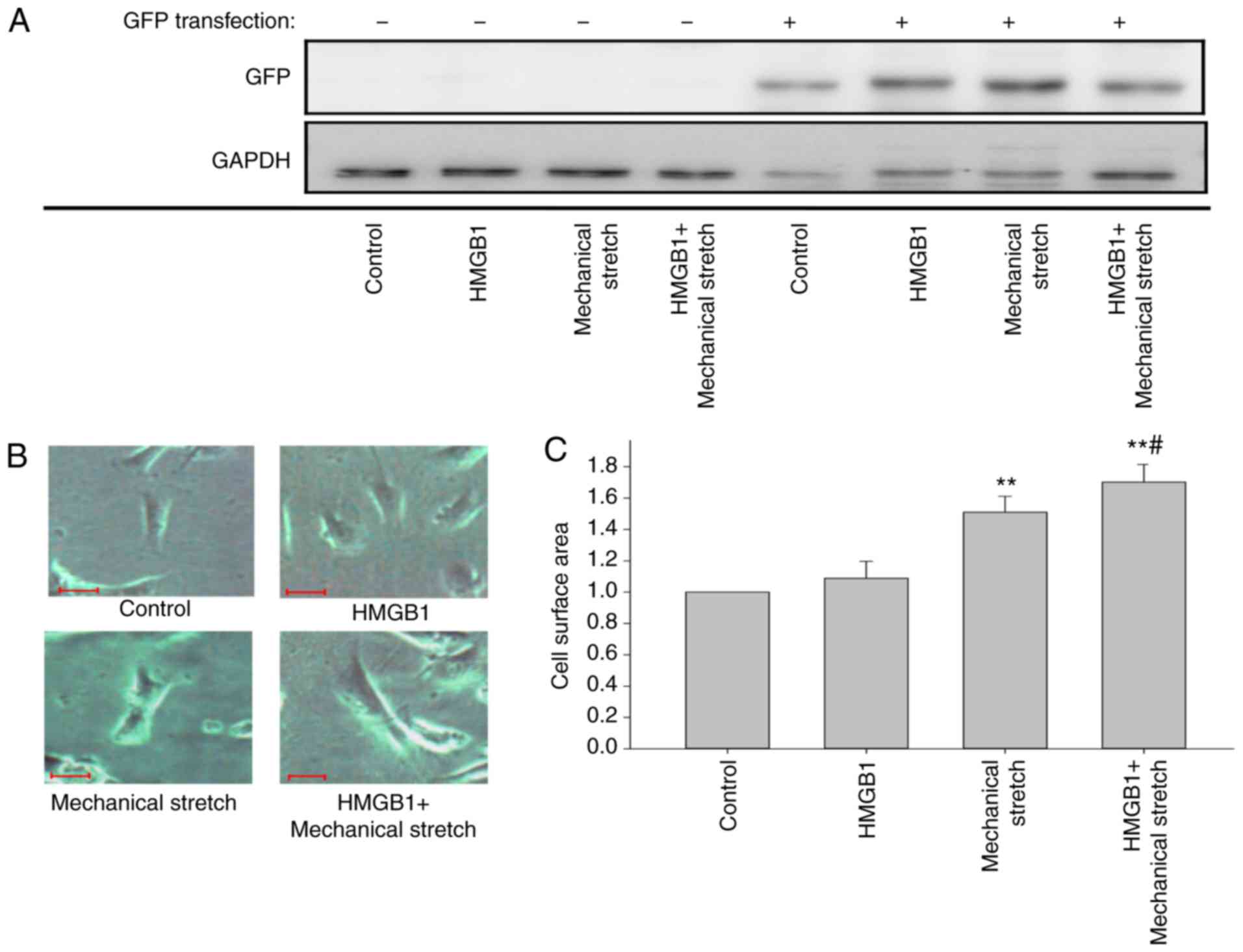 To examine the effect of HMGB1 on cardiomyocyte hypertrophy under mechanical stress, H9C2 cells were transfected with GFP plasmid, and 48 h later, they were stimulated with HMGB1 and/or mechanical stretch. Fig. 1A shows that the transfection of GFP was successful. Compared with that of the control cells, the cell surface area was significantly increased in the cells treated by mechanical stretch for 24 h (P<0.01; Fig. 1B and C), but not in those with HMGB1 stimulation alone. Notably, HMGB1 stimulation combined with mechanical stretch further aggravated the mechanical stress-induced cardiomyocyte hypertrophy (P<0.05; Fig. 1B and C).