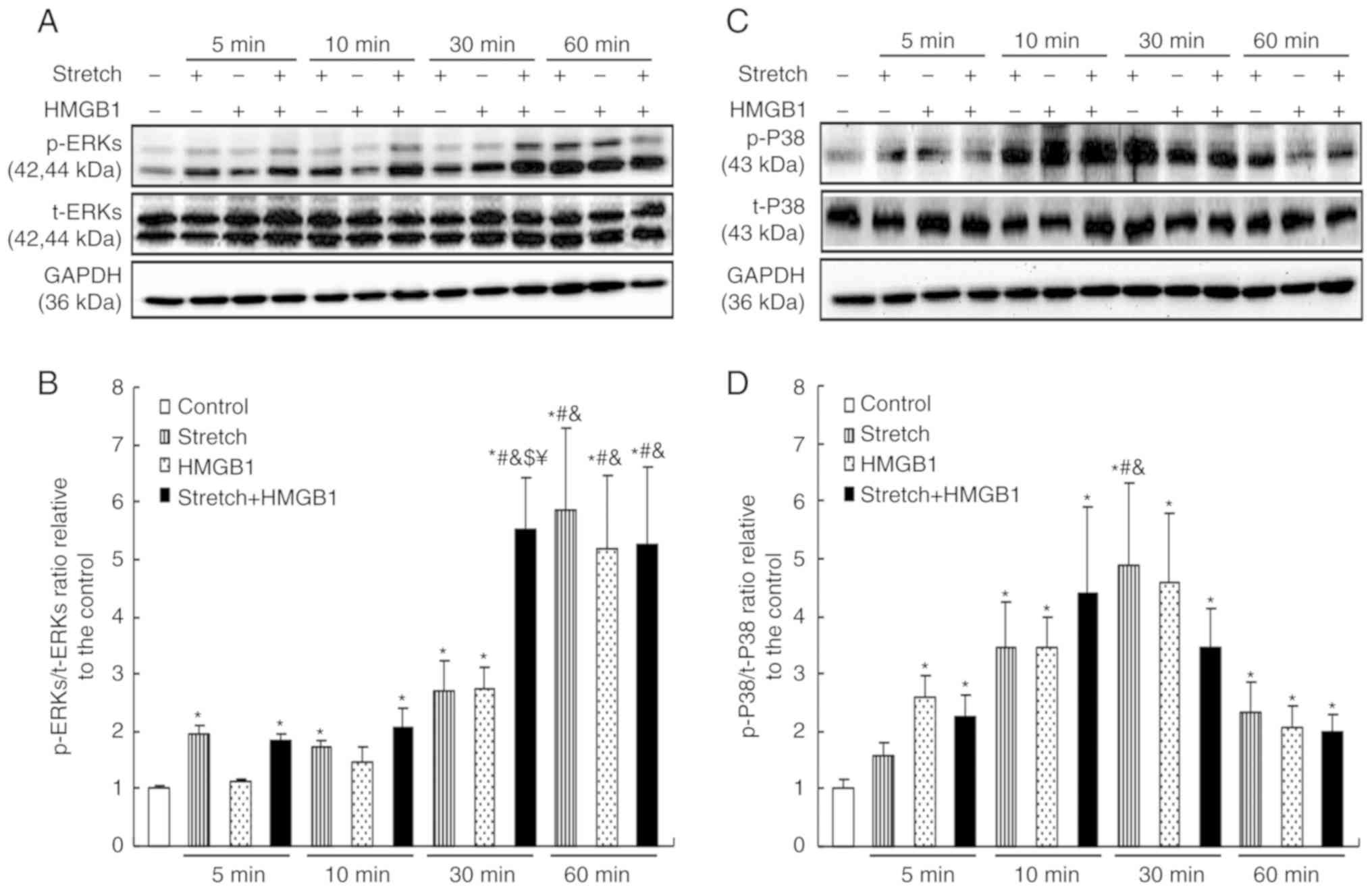 To further investigate the mechanisms of cardiomyocyte hypertrophy induced by mechanical stress and HMGB1 stimulation, the activation status of MAPKs under these conditions was detected. Primary rat neonatal cardiomyocytes were subjected to mechanical stretch and/or HMGB1 stimulation for 0, 5, 10, 30 and 60 min. Western blot analysis results indicated that the levels of p-ERK1/2 were significantly upregulated in cardiomyocytes treated with mechanical stretch (from 5 min onwards) or HMGB1 (from 30 min onwards), in a time-dependent manner (P<0.05). Of note, an additive effect of mechanical stretch and HMGB1 stimulation on the activation of ERK1/2 was observed at 30 min, resulting in a greater increase in p-ERK1/2 compared with that achieved by mechanical stretch or HMGB1 stimulation alone (P<0.05; Fig. 2A and B). Furthermore, the levels of p-P38 in cardiomyocytes were increased by mechanical stretch and by HMGB1 stimulation (P<0.05), but the combined treatment had no additive effect (Fig. 2C and D).