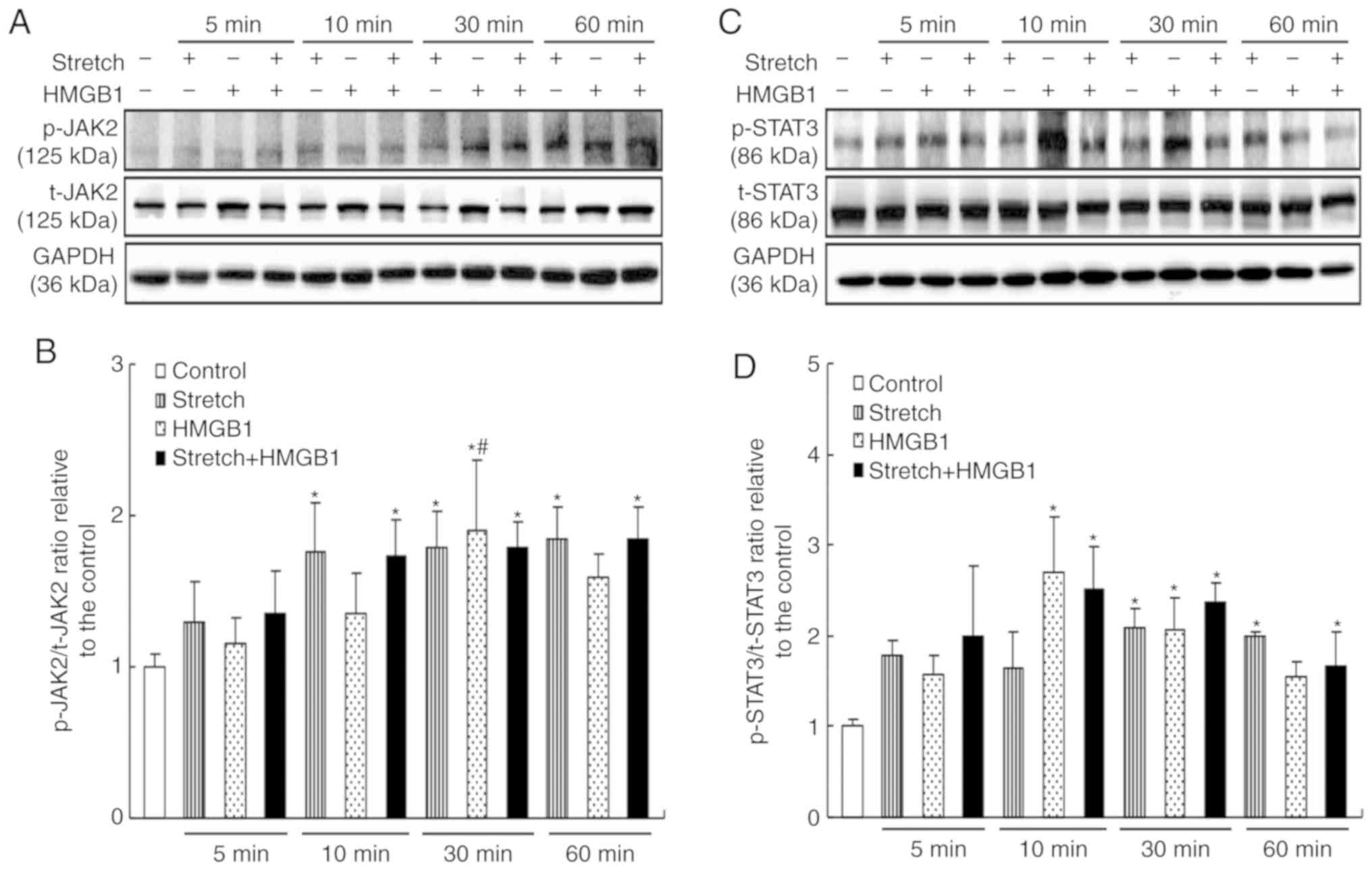 As another important signaling pathway involved in cell hypertrophy, the activation of JAK2/STAT3 was also assessed. It was revealed that the levels of p-JAK2 were upregulated by mechanical stretch and by HMGB1 stimulation, while the former but not the latter maintained the activation of JAK2 (P<0.05; Fig. 3A and B). Furthermore, the levels of p-STAT3 increased from 30 min onwards in the stretch group and from 10 min onwards in the HMGB1 group (P<0.05; Fig. 3C and D). However, no additive effects between mechanical stress and HMGB1 simulation were observed on the activation of JAK2 and STAT3.