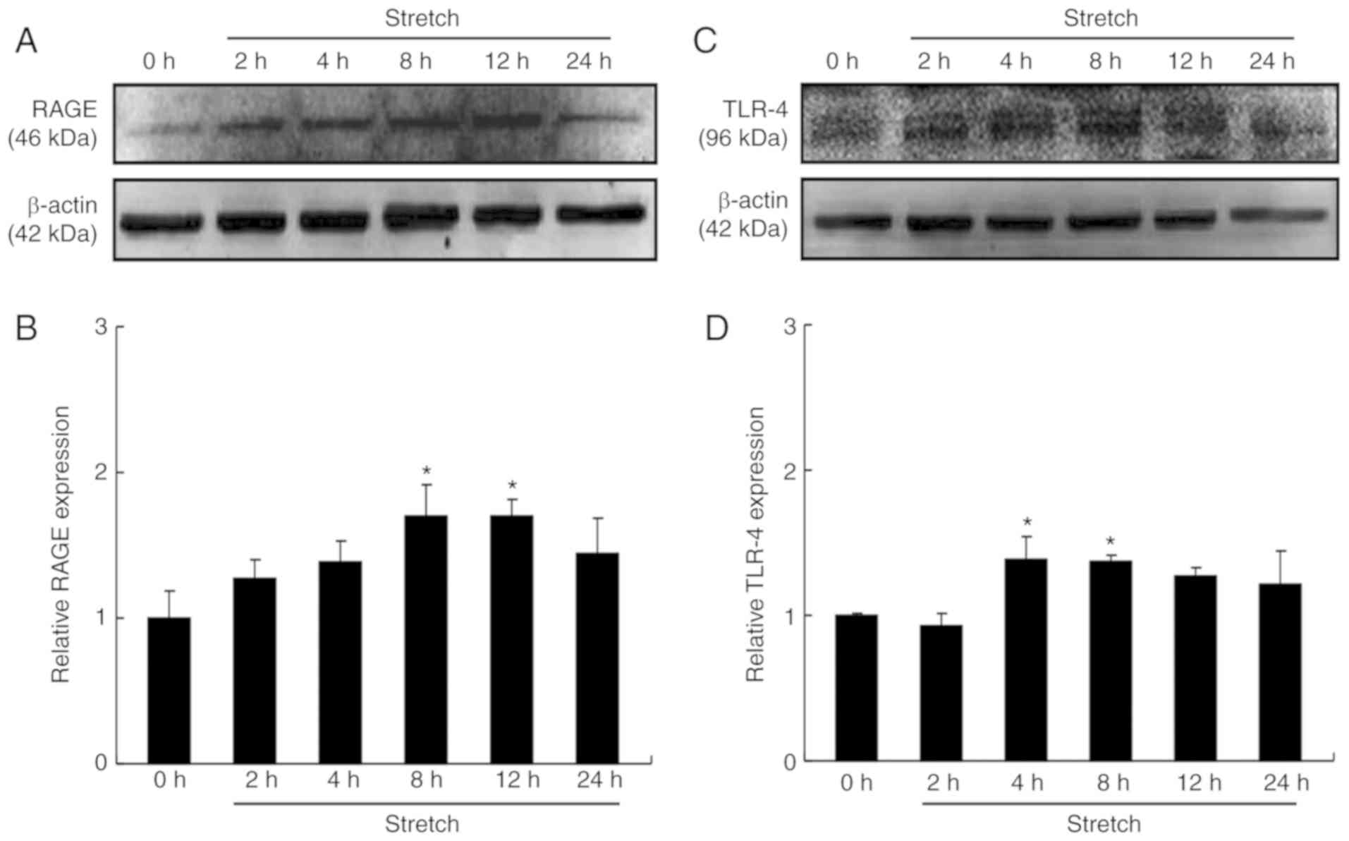 A previous study by our group indicated that cardiac HMGB1 was not only increased but also activated under pressure overload (8). In the present study, the effects of mechanical stretch on the expression of RAGE and TLR-4, two receptors of HMGB1, were explored in cardiomyocytes. The results suggested that the protein expression levels of RAGE were significantly increased at 8 and 12 h (P<0.05; Fig. 4A and B), while TLR-4 expression was significantly increased at 4 and 8 h of stretch (P<0.05; Fig. 4C and D). These results indicated that RAGE and TLR-4 may mediate the additive effect of HMGB1 on pressure overload-induced cardiomyocyte hypertrophy.