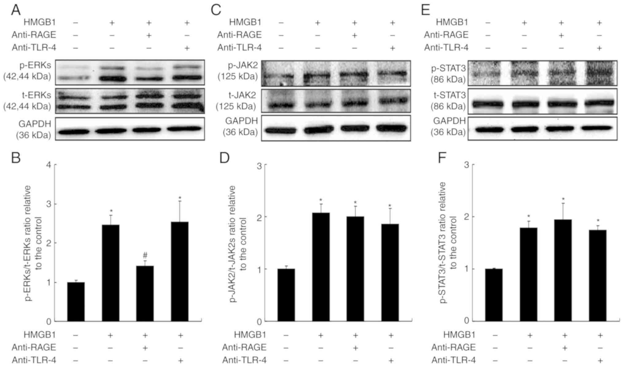 RAGE is a transmembrane receptor that recognizes and combines with a variety of ligands, and RAGE/MAPK/NF-κB signaling exerts an influence on multiple processes, including cell activation, proliferation and migration (48,49). RAGE is involved in a variety of pathologies mediated by HMGB1, and this axis may represent a potential target for cardiac hypertrophy induced by HMGB1 (50). Kim et al (51) reported that HMGB1 induced the activity of fibroblasts via RAGE/MAPK and NF-κB signaling in keloid scar formation, while Andrassy et al (15) demonstrated the pro-inflammatory activity of HMGB1 depended on RAGE activation, since RAGE−/− mice were protected from I/R injury even after administration of HMGB1. In addition, previous studies have revealed that activation of TLR-4 promoted cardiac hypertrophy, while genetic or pharmacological inhibition of TLR-4 had the opposite effect (52-54). In the present study, it was indicated that RAGE blockade significantly attenuated the HMGB1-mediated activation of ERK1/2 in cardiomyocytes, but had no effect on the JAK2/STAT3 pathway. Blocking the TLR-4 receptor appeared to exert no effect on either MAPK or JAK2/STAT3 signaling, suggesting a regulatory role of RAGE to activate ERK1/2 following extracellular HMGB1 stimulation. In the present study, anti-RAGE or anti-TLR-4 neutralizing antibodies were used in cells treated with HMGB1 alone, but their effect on the combined treatment of HMGB1 and mechanical stress was not examined. However, since mechanical stress is a powerful stimulation to cultured cardiomyocytes and RAGE or TLR-4 are only two of the receptors of HMGB1, the role of RAGE or TLR-4 in mediating HMGB1-induced activation of ERK1/2 and JAK2/STAT3 would be difficult to be observed under mechanical stress. Based on the current findings that RAGE was involved in the function of HMGB1, further studies will be performed in the future to explore the roles of these receptors under mechanical stress. In addition, cell function or damage will be also evaluated in future studies, in order to fully explore the mechanisms of HMGB1 in cardiomyocyte impairment.
