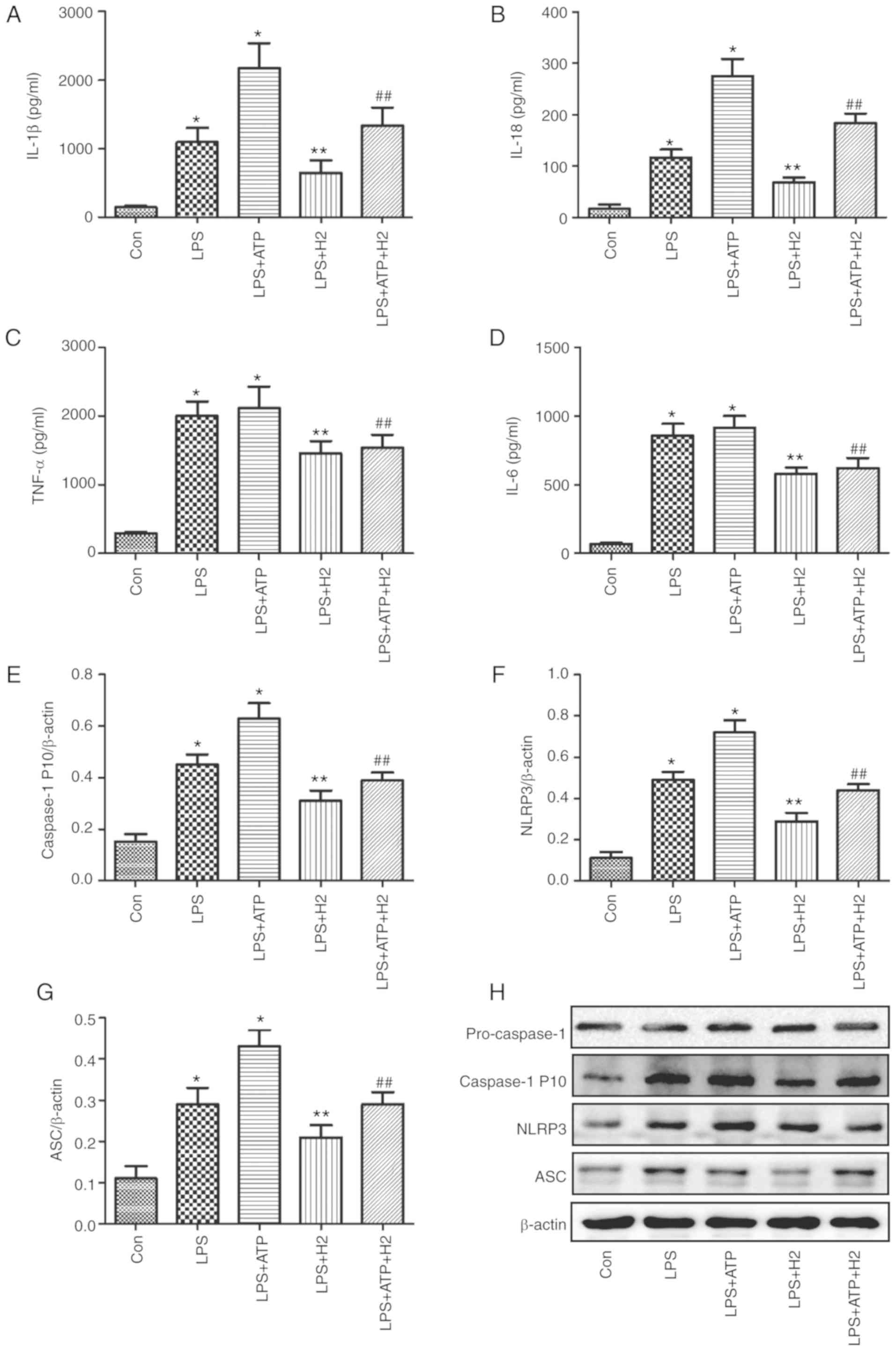 Macrophages can express intracellular Nod-like receptors (NLRs) when induced by detrimental stimulation. The NLRP3 inflammasome is a critical member of the NLR family, as it interacts with ASC and sequentially regulates the expression of mature IL-1β, IL-18 and caspase-1. The NLRP3 inflammasome pathway protein was investigated in the present study. Consistent with the changes in IL-1β, IL-18 and caspase-1 P10, LPS and ATP activated the inflammasome, NLRP3 (Fig. 1F and H) and increased the expression of ASC (Fig. 1G and H) (P<0.05), and there was a significant difference between groups LPS and LPS+ATP (P<0.05). The expression levels of NLRP3 (Fig. 1F and H) and ASC (Fig. 1G and H) were reduced in the LPS+H2 and LPS+ATP+H2 groups compared with those in the LPS and LPS+ATP groups, respectively (P<0.05). These data indicated that LPS and ATP activated the inflammasome and promoted the maturation and release of cytokines, whereas H2 alleviated inflammasome activation and the release of cytokines in response to LPS and ATP.