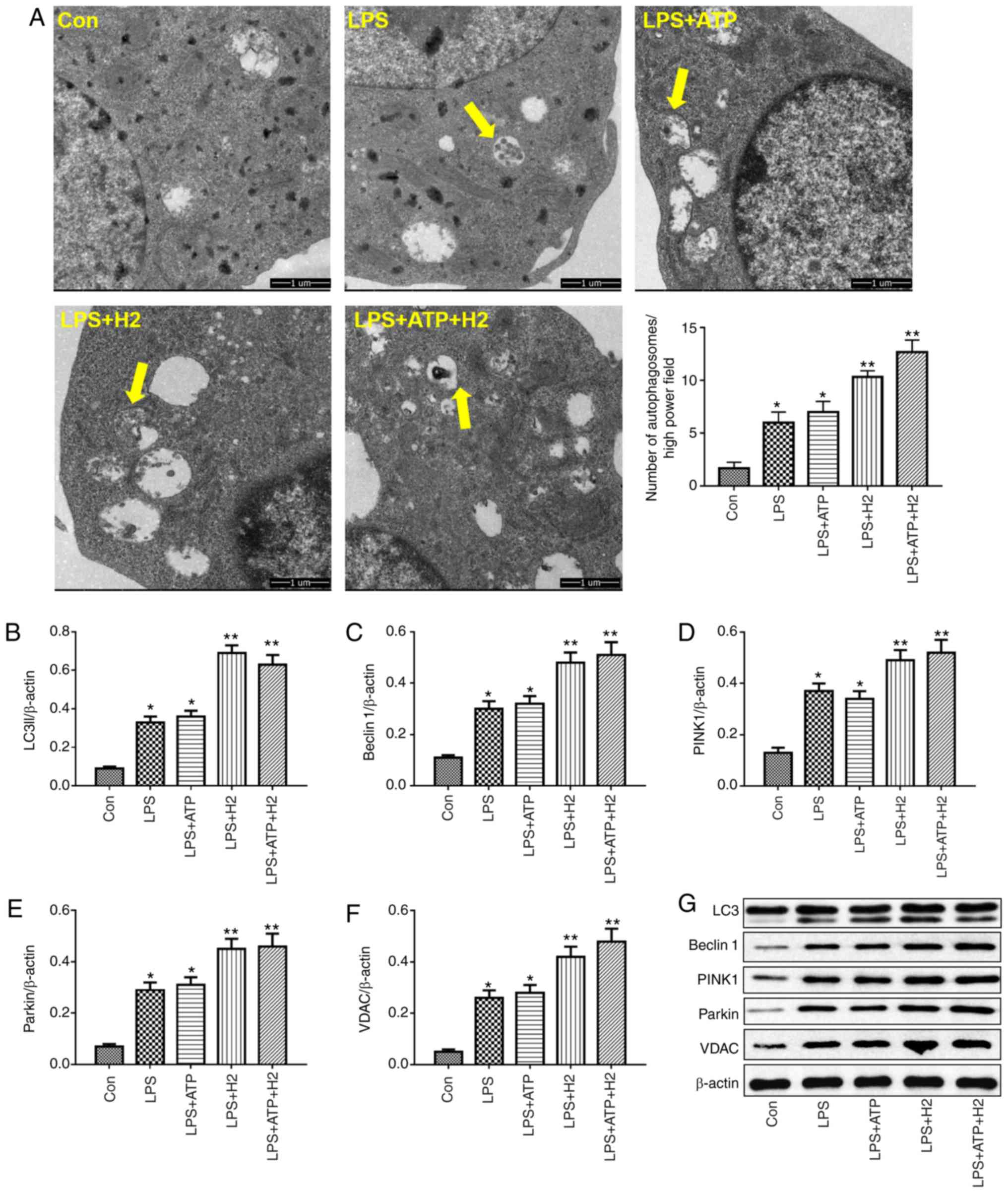 Autophagy is a vital process responsible for removing senescent or damaged organelles. LC3I, a cytosolic form of LC3, is conjugated to phosphatidylethanolamine to form LC3-phosphatidylethanolamine conjugate (LC3II), which reflects the autophagic activity. Beclin 1 is a core component of the autophagy machinery. LPS or LPS+ATP induced the increasing of number of autophagosomes compared with that in the Con group (Fig. 3A, P<0.05), H2 treatment further promoted the number of autophagosomes in the LPS+H2 group and LPS+ATP+H2 group compared with that in the LPS group or LPS+ATP group, respectively (Fig. 3A, P<0.05). As shown in Fig. 3B, C and G, LPS and ATP enhanced autophagic activity, as indicated by the alternation of LC3I into LC3II and the increased expression of Beclin 1 in macrophages (P<0.05), whereas H2 further promoted the process of autophagy. The expression levels of LC3II and Beclin 1 were further elevated in the LPS+H2 and LPS+ATP+H2 groups compared with those in the LPS or LPS+ATP groups, respectively (P<0.05).