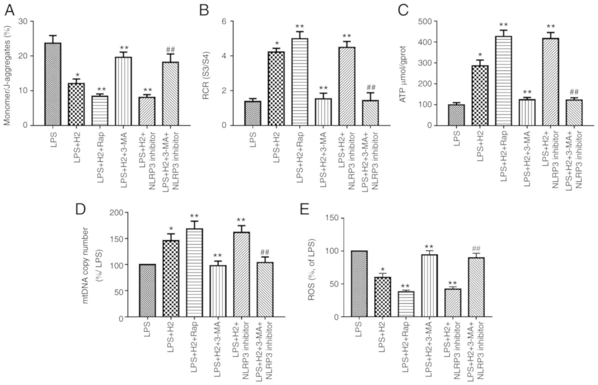 Primary alveolar macrophages (PAMs) were obtained from 60 male C57BL/6 adult mice (weight 20-25 g; age, 6-8 weeks; Laboratory Animal Center of the Academy of Military Medical Sciences). All the mice had free access to standard animal chow and water, and were housed at room temperature (20-22°C) with 30-70% humidity on a 12-h light/dark cycle. Following sacrifice of the mice, the lungs were removed and washed in warm sterile phosphate-buffered saline (PBS) supplemented with 5 mM EDTA five times; the bronchoalveolar lavage (BAL) fluid was collected and centrifuged at 500 × g 4°C for 5 min. The cells were resuspended in DMEM supplemented with 10% (v/v) FBS, 1% (v/v) penicillin and streptomycin to adjust the cell density to 1.5×106/ml. The cells were seeded into 6-well plates and incubated at 37°C/5% CO2 to allow the cells to adhere for 2 h. The adherent PAMs were then collected for the following experiments. The cells were randomly divided into two for two experiment parts: The first part of the experiment included five groups, as follows: Control, LPS (cells were incubated with 1 µg/ml LPS for 6 h with normal medium), LPS+ATP (cells were incubated with 1 µg/ml LPS for 5 h followed by treatment with 5 mM ATP for 1 h with normal medium), LPS+H2 (cells were incubated with 1 µg/ml LPS for 6 h with H2-rich medium), and LPS+ATP+H2 (cells were incubated with 1 µg/ml LPS for 5 h followed by treatment with 5 mM ATP for 1 h with H2-rich medium). The second part of the experiment included six groups, as follows: LPS, LPS+H2, cecal ligation and puncture (CLP)+H2+rapamycin (Rap; BioVision, Inc., 10 nM Rap was added to the H2-rich medium 1 h before LPS treatment), CLP+H2+3-MA (BioVision, Inc.; 1.5 mM 3-MA was added to the H2-rich medium 1 h before LPS treatment), CLP+H2+NLRP3 inhibitor (20 µM NLRP3 inhibitor MCC950, Sigma Aldrich; Merck KGaA, was added into the H2-rich medium 1 h before LPS treatment), and CLP+H2+NLRP3 inhibitor+3-MA [20 µM NLRP3 inhibitor and 10 mg/kg 3-MA, (BioVision, Inc.)] were added to the H2-rich medium 1 h before LPS treatment). The culture supernatants of the first and the second parts of the experiment were collected to detect IL-1β, IL-18, TNF-α and IL-6 by ELISA. The cells were collected to evaluate mitochondrial function through mitochondrial membrane potential (MMP), the respiratory control ratio (RCR), ATP content and mtDNA, to analyze the protein expression of caspase-1 P10, NLRP3, ASC, microtubule-associated protein 1 light chain 3 (LC3), Beclin 1, PINK1, Parkin and voltage-dependent anion channel (VDAC) by western blotting, and to examine the mRNA expression of LC3, Beclin 1, PINK1 and Parkin by reverse transcription-quantitative polymerase chain reaction (RT-qPCR) analysis.