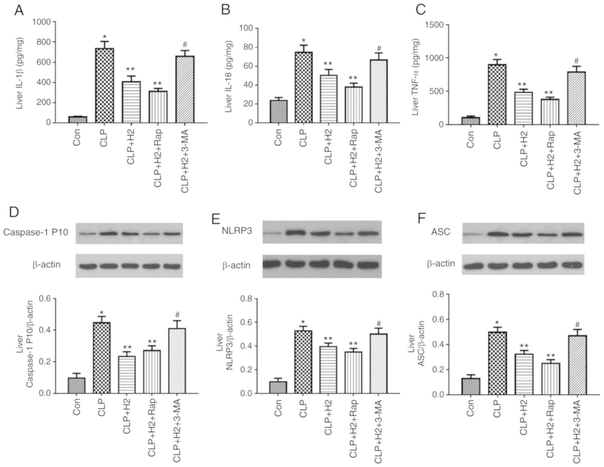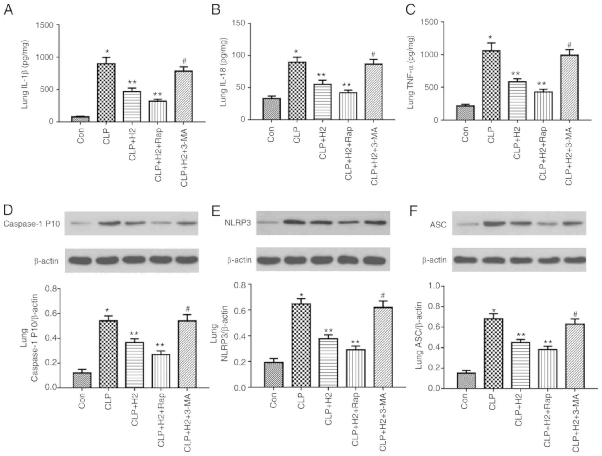 Another 130 male C57BL/6 mice (weighing 20-25 g and aged 6-8 weeks) were obtained from the Laboratory Animal Center of the Academy of Military Medical Sciences (Beijing, China). All mice had free access to standard animal chow and water and were housed at room temperature (20-22°C) with 30-70% humidity on a 12/12-h light/dark cycle. All experimental procedures were approved by the Institutional Animal Care and Use Committee of Tianjin Medical University (Tianjin, China) and were performed in accordance with the National Institutes of Health Guide for the Care and Use of Laboratory Animals. All efforts were made to minimize the suffering of the 130 mice (n=23/group) used. A sepsis model was established by CLP as previously described (18). The mice were randomly divided into seven groups as follows: Control, CLP, CLP+H2 [H2-rich saline (5 ml/kg) was injected i.p. 1 and 6 h following the sham and CLP procedures], CLP+H2+Rap (Rap, an inducer of autophagy, was administered by intraperitoneal injection at 10 mg/kg BW 1 h before CLP; H2 treatment was as in the CLP+H2 group), CLP+H2+3-MA (3-MA, an inhibitor of autophagy, was administered by intraperitoneal injection at 15 mg/kg BW 1 h before CLP; H2 treatment was as for the CLP+H2 group). Subsequently, the mice were anesthetized with sodium pentobarbital (50 mg/kg, intraperitoneally) and sacrificed via decollation; lung tissues were collected to determine the tissue pathological scores by hematoxylin and eosin (H&E) staining, wet-to-dry (W/D) weight ratio and myeloperoxidase (MPO) activity. BAL fluid was collected to analyze the total proteins in the lung. Liver and kidney tissues were collected to investigate pathological scores. Blood and tissue homogenates of the lung, liver and kidney were obtained to detect the biochemical parameters of the liver and kidney, and the levels of IL-1β, IL-18 and TNF-α by ELISA. Other parts of the lung, liver and kidney were collected and proteins were extracted for the detection of procaspase-1, caspase-1 P10, NLRP3 and ASC by western blotting. The survival rate was analyzed 1, 2, 3, 5 and 7 days after surgery.