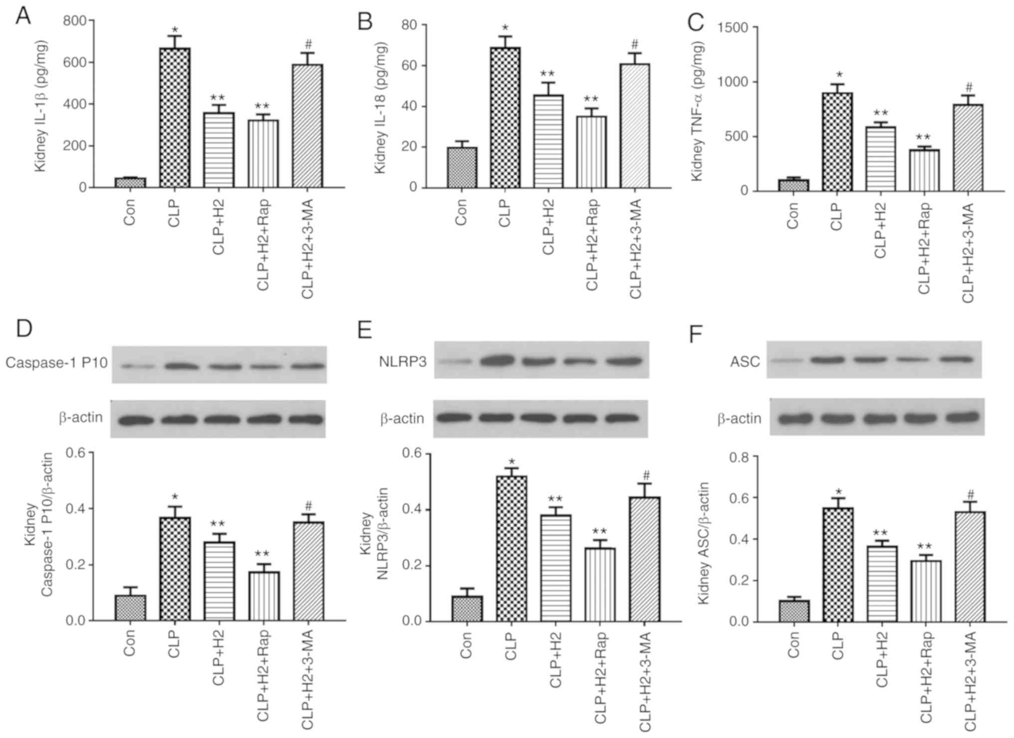 These data suggest that H2 and the autophagy inducer Rap exerted a protective effect against acute lung, liver and kidney injury induced by CLP and that H2 improved the acute changes in the lung, liver and kidney induced via autophagy-mediated NLRP3 inflammasome inactivation in sepsis.