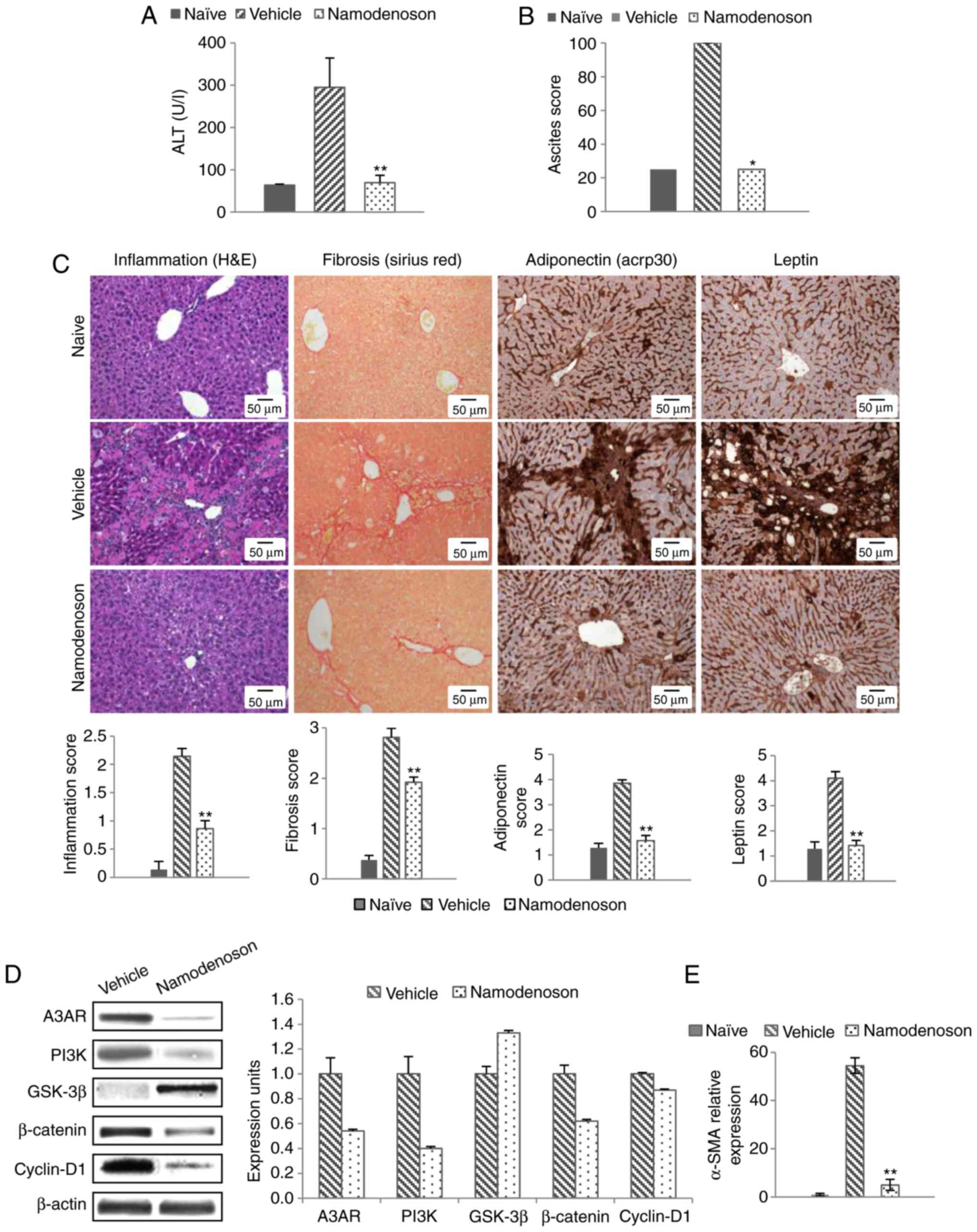 In the CCl4 model, the serum ALT levels increased from 63.65±2.36 to 294.75±69.24 (P<0.01). Namodenoson significantly decreased the serum ALT levels, returning them to near normal levels (69.35±17.64; P<0.01; Fig. 2A). Namodenoson also reversed the ascites induced by CCl4 compared to the vehicle-treated group (P<0.05; Fig. 2B). Morphometric analysis of the liver sections derived from the CCL4-treated mice revealed an upregulation of inflammation, fibrosis, adiponectin and leptin, whereas a significant reduction was noted in the samples derived from the Namodenoson-treated mice (P<0.01; Fig. 2C).