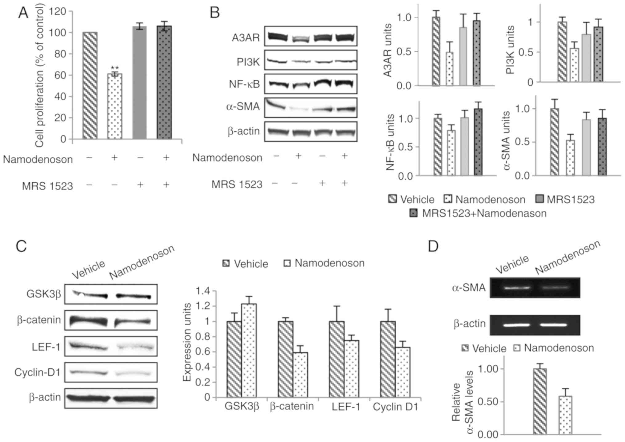 Namodenoson inhibited LX2 cell proliferation as was measured by 3H-thymidine incorporation. The highly specific A3AR antagonist, MRS 1523, counteracted the inhibitory effect of Namodenoson (P<0.01; Fig. 3A). Western blot analysis revealed that upstream, Namodenoson treatment induced the downregulation of A3AR, PI3K, NF-κB and α-SMA expression; these effects were reversed by MRS 1523, demonstrating the specificity of the response to the agonist (Fig. 3B). Downstream, GSK-3β was up-regulated whereas β-catenin, Lef-1 and cyclin D1 were down-regulated (Fig. 3C). Moreover, a decrease in α-SMA mRNA expression was noted (Fig. 3D). As can been seen, the protein profile was very similar to that of the liver extracts derived from the Namodenoson-treated CCL4 animals, supporting the notion that Namodenoson deregulates the Wnt/β-catenin pathway.