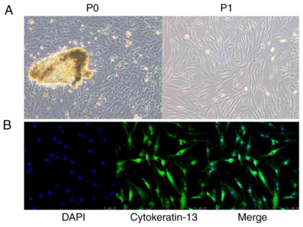 PECs were isolated and cultured using previously established methods (10,16). Fresh primary pterygium samples at the advanced stage were washed with PBS with 1% penicillin (100 units/ml) and streptomycin (100 µg/ml) (Gibco; Thermo Fisher Scientific, Inc.). After the fibrovascular tissue was removed as much as possible, the remaining epithelial tissues were cut into small pieces of 1×1 mm and then cultured in DMEM supplemented with 10% FBS (Gibco; Thermo Fisher Scientific, Inc.), 100 U/ml penicillin and 100 mg/ml streptomycin at 37°C with 5% CO2 in a humidified incubator. The solution was changed once every 2-3 days, and after the cells covered the bottom of the bottle, the cells were digested with 0.25% trypsin (Gibco; Thermo Fisher Scientific, Inc.) at 37°C for 2 min. Under a phase-contrast microscope, once cytoplasmic retraction and enhanced refractive index had been observed, 2 ml medium with 10% FBS was added to terminate digestion. The cell suspension was prepared, counted and inoculated. Finally, PECs were seeded in serum-free DMEM and cultured at 37°C, 5% CO2, in a saturated humidity incubator. The cells from primary culture using tissue were defined as primary passage cells (P0) and the cells from the first passage after the primary culture were defined as first passage PECs (P1). The morphology of cells was relatively uniform, showing a fibrous/fusiform shape. Immunofluorescence results confirmed that almost all cells (P2) were positively stained with anti-cytokeratin 13 (cat. no. ab32522; 1:200; Abcam) at 4°C overnight, so the cell purity was considered to be very high, close to 100% (Fig. 1).