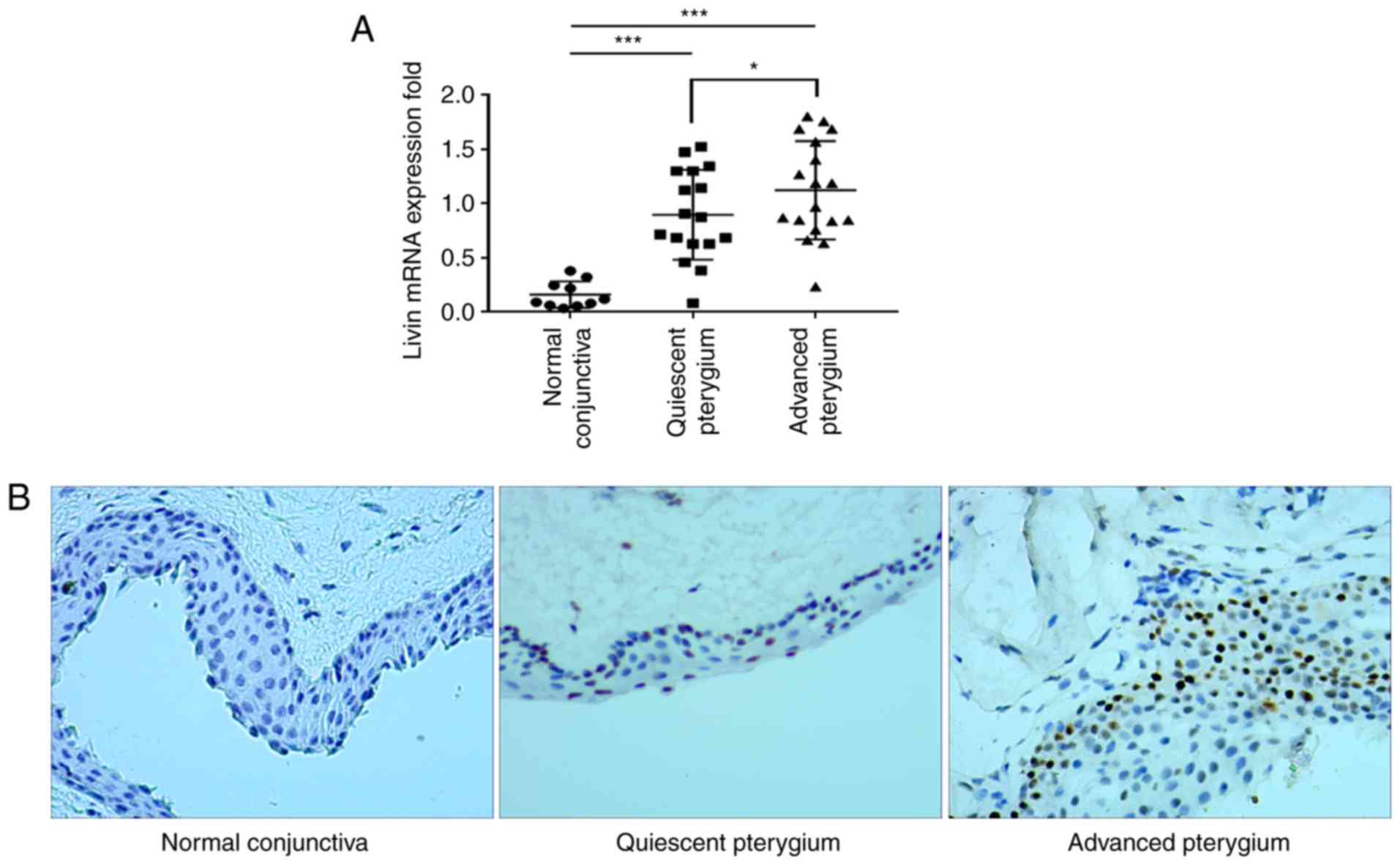Normal conjunctival tissue and pterygium were cut and ground, then 1 ml TRIzol® (EZBioscience) was used to extract total cellular RNA according to the manufacturer's protocol. Subsequently, RNA purity and concentration were measured using a Nanodrop 2000 (Thermo Fisher Scientific, Inc.), then RNA was reverse transcribed to cDNA using a Revert Aid First Strand cDNA Synthesis kit (Thermo Fisher Scientific, Inc.). qPCR was performed using SsoAdvance Universal SYBR-Green Supermix (Bio-Rad Laboratories, Inc.). PCR was performed at 95°C for 3 min, then for 40 cycles at 95°C for 10 sec, 60°C for 30 sec and 72°C for 30 sec. The primer sequences of the target genes were as follows: Livin forward, 5′-ACA GAG GAG GAA GAG GAG GAG G-3′ and reverse 5′-GCA GTC AGC GGC CAG T CA T-3′; and β-actin forward, 5′-GAA CCC TAA GGC TAA CAG AGA AA-3′ and reverse, 5′-CCA CTA GCA TAA AGG GAG AG A AC-3′. β-actin was used as an internal control. The experimental results were automatically calculated using a CFX96TouchTM Real-Time PCR Detection system (Bio-Rad Laboratories, Inc.). The relative expression of Livin gene was expressed as a fold-increase of β-actin calculated using the 2−ΔΔCq method (17).