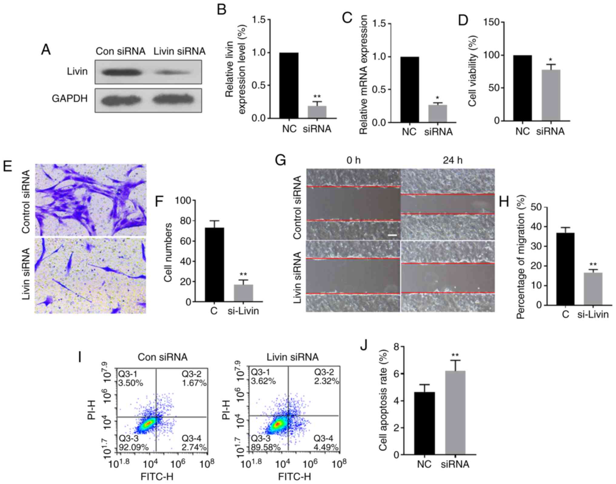 To further evaluate the role of Livin in pterygium development and progression, ex vivo cultured PECs were transfected with Livin-siRNA or control siRNA. Western blot analysis showed that the expression levels of Livin protein and mRNA were significantly downregulated in the Livin-siRNA-transfected group compared with those in the control group, suggesting successful knockdown of Livin in Livin-siRNA-transfected PECs (Fig. 3A-C). Knockdown of Livin expression significantly reduced invasion, migration and viability of PECs (Fig. 3D-H) and the proportion of apoptotic cells was increased in Livin-siRNA-transfected PECs compared with that in negative control siRNA-transfected PECs (Fig. 3I and J).