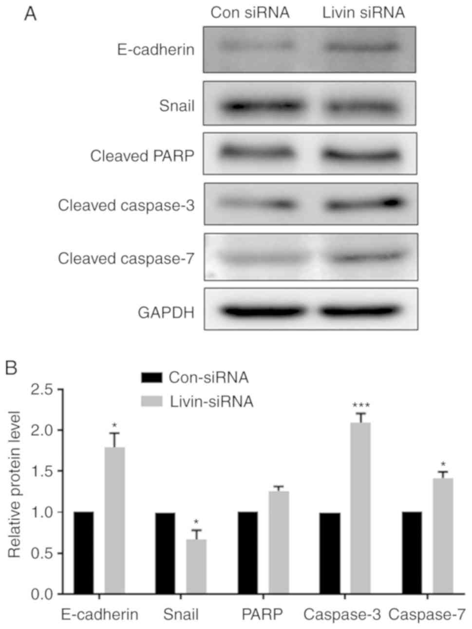 Previous studies have demonstrated that EMT is an initial step required for cell metastasis and that it has a role in apoptotic resistance (19). Therefore, the role of Livin in regulating the expression of EMT-associated proteins was also investigated. The data indicate that knockdown of Livin expression significantly increased E-cadherin and reduced Snail expression levels (Fig. 4A and B), indicating Livin is involved in the regulation of EMT. The protein expression levels of apoptosis-associated enzymes, caspase-3 and 7, were significantly increased in the Livin-knockdown PECs. PARP protein expression levels were also increased in Livin-knockdown PECs, but this difference was not significant (Fig. 4B).