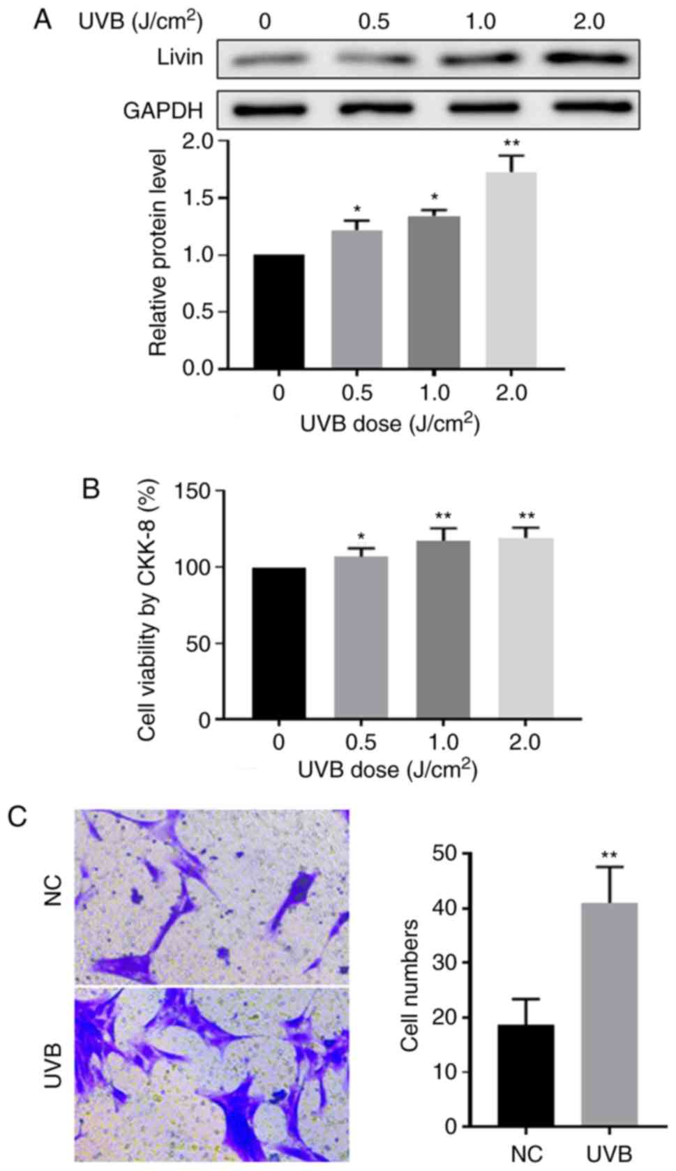 UVB is a major risk factor for pterygium development (3). To further investigate the association between Livin expression levels and cell viability and invasion following UVB irradiation, ex vivo PECs in culture were treated with UVB radiation. Compared with the non-radiation treatment group, Livin protein expression levels were significantly increased in UVB irradiation-treated PECs (Fig. 5A) and PEC viability was significantly increased with increasing doses of UVB radiation (Fig. 5B). In addition, cell invasion was promoted by UVB irradiation (Fig. 5C).