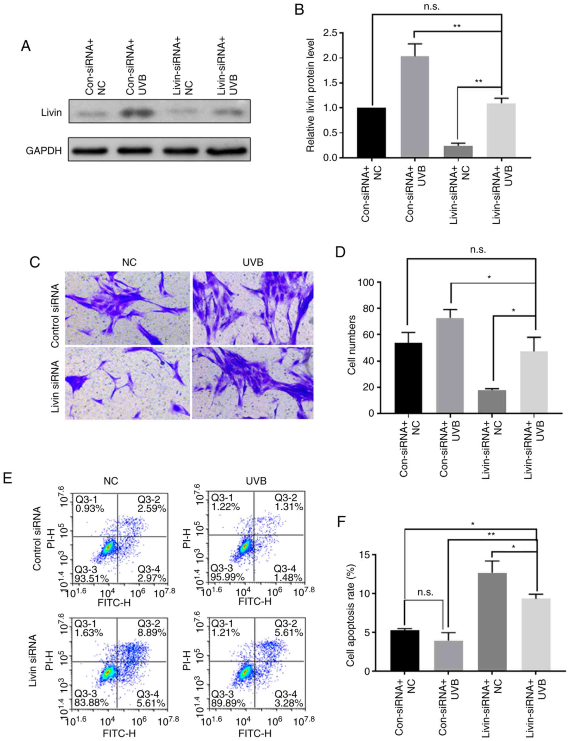 Western blot analysis was used to evaluate Livin protein expression following UVB irradiation with or without Livin-knockdown. Livin-knockdown followed by UVB irradiation resulted in partial inhibition of UVB-induced Livin protein expression (Fig. 6A and B). In the invasion experiments, UVB induced an increase in cell invasion ability, which was attenuated by Livin silencing (Fig. 6C and D). Cell apoptosis analysis revealed that UVB irradiation reduced apoptosis of PECs, and transfection with Livin-siRNA prior to UVB irradiation increased the apoptosis of PECs compared with the control siRNA group (Fig. 6E and F).