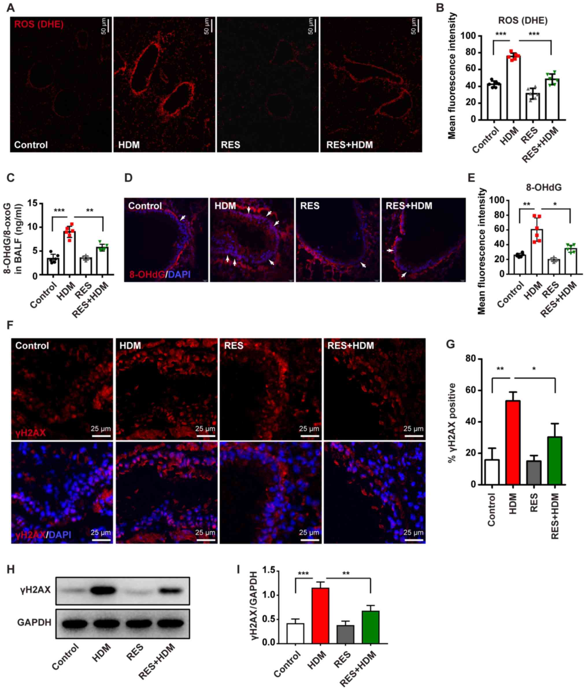 It was revealed that exposure to HDM caused a significant increase in ROS levels (Fig. 2A and B) in a mouse model of asthma and ROS is known to cause DNA damage (29,30). To quantify oxidative damage to nucleic acids, 8-OHdG/8-oxoG levels were detected in BALF and lung tissue. The levels of 8-OHdG were markedly increased in the BALF of mice with HDM-induced asthma and 8-OHdG/8-oxoG could be simultaneously inhibited via treatment with RES (Fig. 2C). IF staining also revealed that RES attenuated 8-OHdG levels in airway epithelial cells of mice with HDM-induced asthma (Fig. 2D and E). To further confirm this finding, another DNA damage-related gene, γH2AX, was analyzed. HDM increased the expression level of γH2AX, which was detected by IF staining (Fig. 2F and G) and western blotting (Fig. 2H and I); however, these processes were blocked by treatment with RES, and the expression level of γH2AX was decreased. Collectively, these findings suggested that RES can inhibit DNA damage in a mouse model of asthma.
