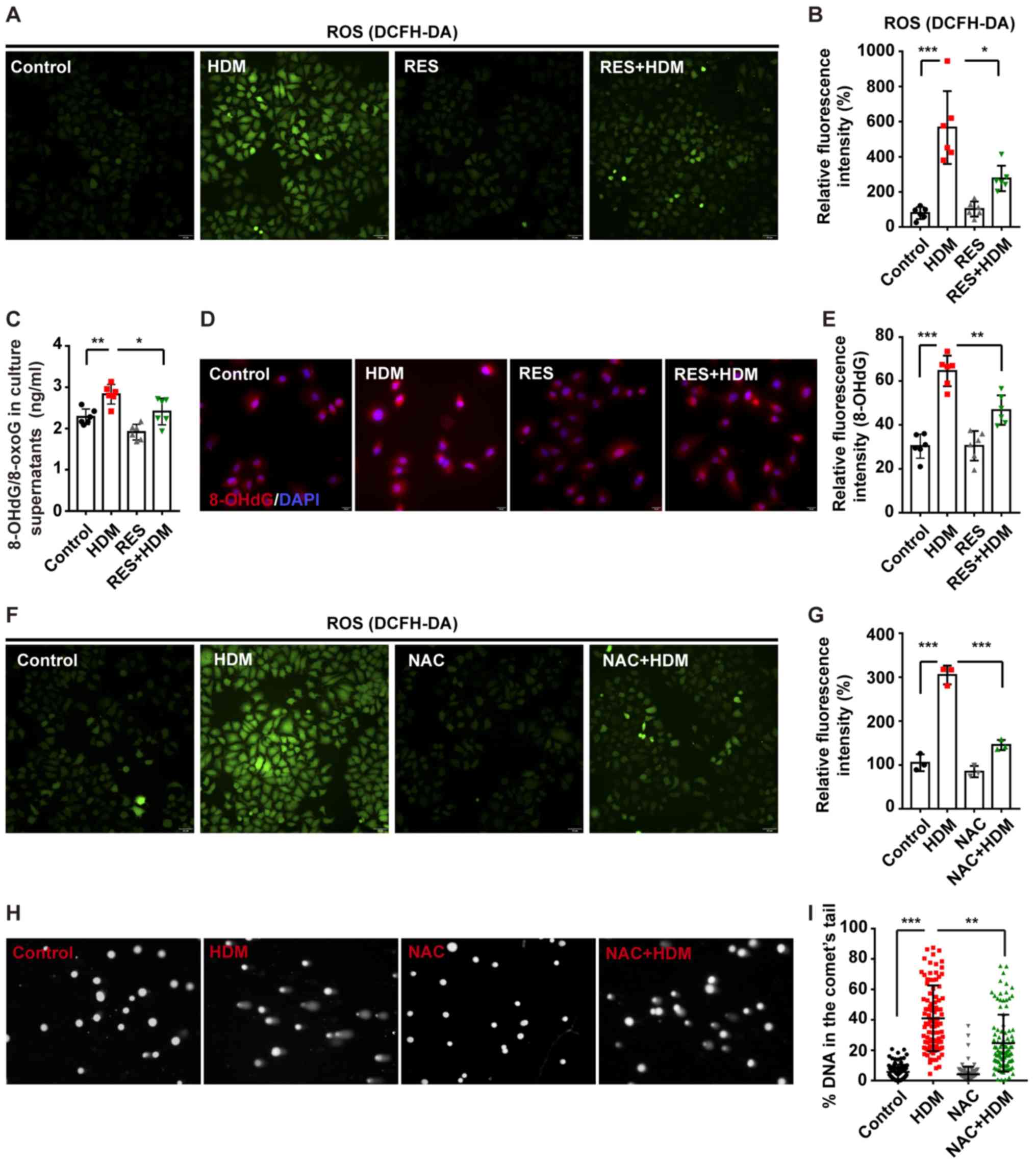 Through detection by DCFH-DA assay, ROS in bronchial epithelial cells were significantly increased after treatment with HDM and the increased ROS levels in bronchial epithelial cells were restored via combination treatment with HDM and RES (Fig. 4A and B). Further testing demonstrated that 8-OHdG/8-oxoG in bronchial epithelial cells, which serves as a marker of oxidative DNA damage, was increased by treatment with HDM and the 8-OHdG/8-oxoG could be simultaneously protected via treatment with RES (Fig. 4C). IF staining also proved that RES attenuated the 8-OHdG level increased by HDM in bronchial epithelial cells (Fig. 4D and E). To further explore the damaging effects of excessive ROS generation on DNA, NAC was used to inhibit the oxidative stress induced by HDM (Fig. 4F). As expected, an elevation in ROS levels was accompanied by increased DNA damage (Fig. 4F-I) following treatment with HDM, while inhibition of ROS generation by NAC was associated with a decrease in DNA damage (Fig. 4F-I). These results suggested that RES inhibits oxidative DNA damage by reducing ROS levels.