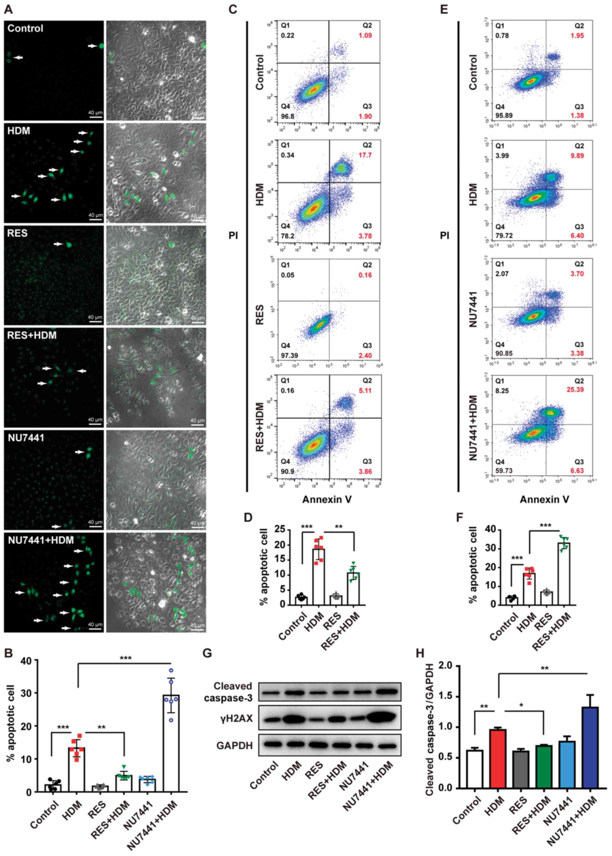 To investigate the effects of DNA damage on apoptosis induced by HDM, DNA double-strand breaks repair inhibitor NU7441 was used to inhibit DNA repair. IF staining revealed that HDM-induced apoptosis was further enhanced by NU7441 (Fig. 5A and B). Flow cytometry analysis also demonstrated that NU7441 led to a higher level of HDM-induced apoptosis (Fig. 5E and F). Furthermore, western blotting revealed that NU7441 treatment resulted in an increase in the levels of cleaved caspase-3 and γH2AX following combination treatment with HDM and NU7441 compared with treatment with HDM alone (Fig. 5G and H). In addition, RES inhibited γH2AX and cleaved caspase-3 in bronchial epithelial cells (Fig. 5G and H). Taken together, these results indicate that RES protects bronchial epithelial cells from apoptosis through preventing DNA damage.