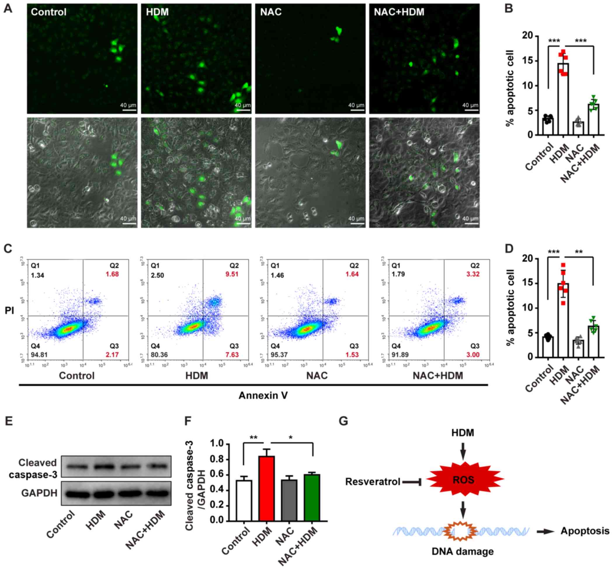 In order to further examine the role of oxidative stress in apoptosis induced by HDM, NAC was used to inhibit the oxidative stress induced by HDM. IF staining revealed that apoptosis was significantly reduced in bronchial epithelial cells treated with HDM and NAC compared with bronchial epithelial cells treated with HDM alone (Fig. 6A and B). Flow cytometry analysis also demonstrated that NAC could attenuate apoptosis of bronchial epithelial cells exposed to HDM (Fig. 6C and D). Furthermore, the western blotting results revealed that NAC reduced cleaved caspase-3 level in the epithelial cells subjected to HDM treatment (Fig. 6E and F). Collectively, these data indicate that RES protects bronchial epithelial cells from apoptosis through inhibiting oxidative DNA damage (Fig. 6G).