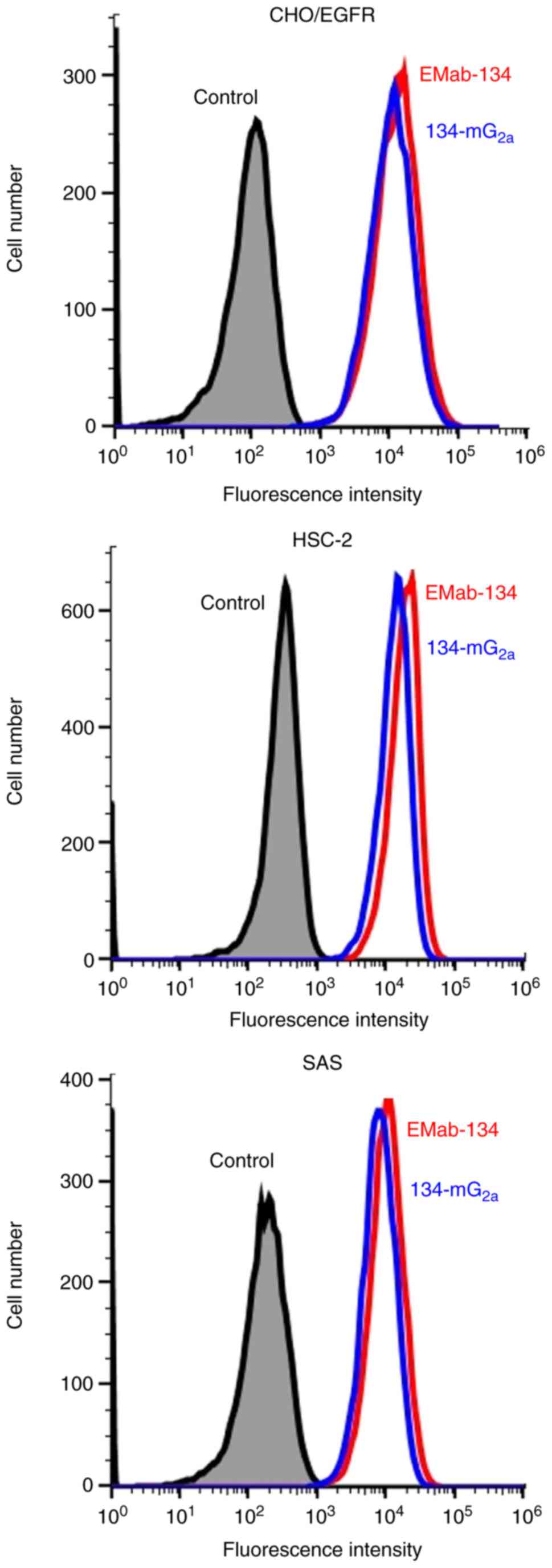 As mouse IgG2a subclass facilitates both ADCC and CDC (22), in the present study, a mouse IgG2a version of the IgG1 EMab-134 (14) was generated by subcloning VH cDNA of EMab-134 and CH mouse IgG2a into pCAG-Ble vector, and VL and CL cDNAs of EMab-134 into pCAG-Neo vector. The IgG2a version of EMab-134 was named 134-mG2a. The sensitivity of 134-mG2a in CHO/EGFR, HSC-2 and SAS cells was analyzed by flow cytometry. As shown in Fig. 1, EMab-134 and 134-mG2a were equally effective at detecting CHO/EGFR, HSC-2 and SAS cells using this method.