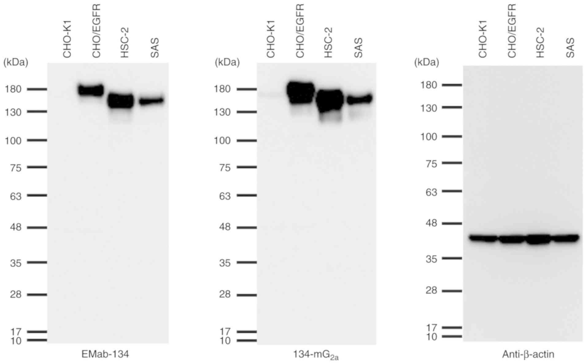 Itai S, Yamada S, Kaneko MK, Chang YW, Harada H and Kato Y: Establishment of EMab-134, a sensitive and specific anti-epidermal growth factor receptor monoclonal antibody for detecting squamous cell carcinoma cells of the oral cavity. Monoclon Antib Immunodiagn Immunother. 36:272–281. 2017. View Article : Google Scholar : PubMed/NCBI | |