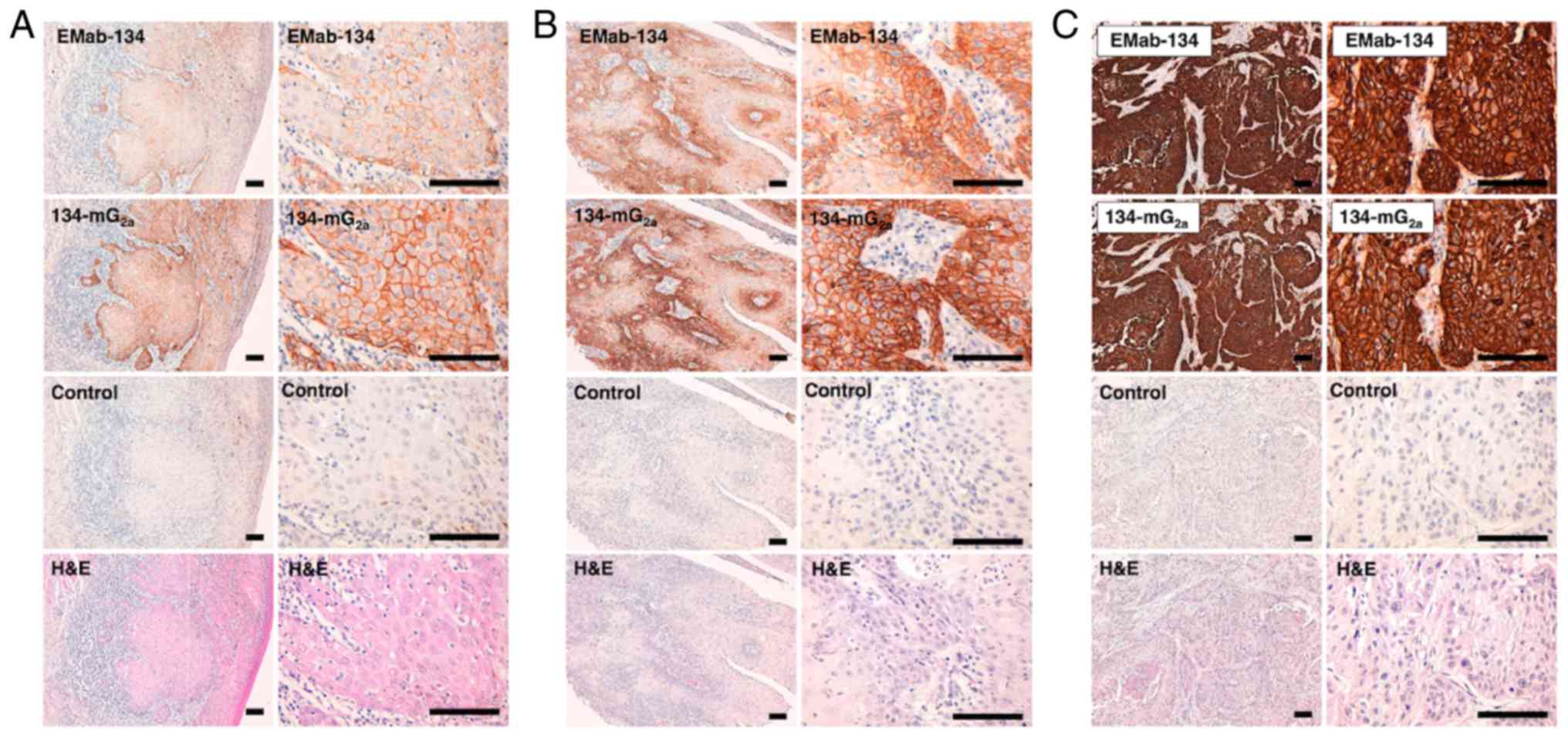 Immunohistochemical analysis revealed that both EMab-134 and 134-mG2a detected membrane antigens in oral cancer tissues (Fig. 3). 134-mG2a exhibited higher staining intensities when compared to the results from EMab-134 in several oral cancer tissues with various levels of EGFR expression; intensities included 1+ (Fig. 3A), 2+ (Fig. 3B) and 3+ (Fig. 3C). No staining was observed in tissues incubated with the buffer control.