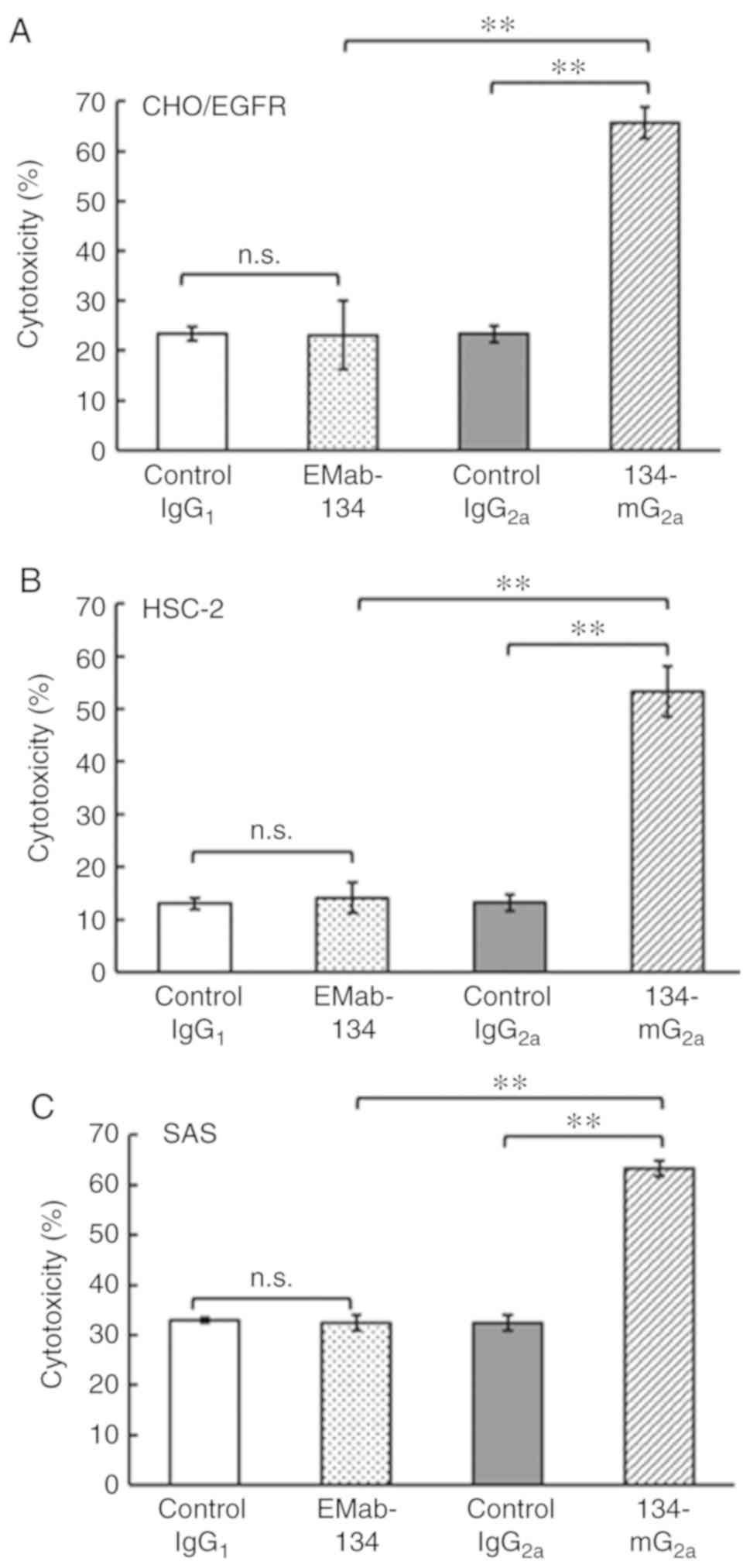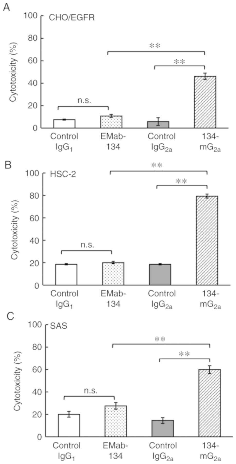 Subsequently, whether the newly-developed 134-mG2a was capable of mediating ADCC against CHO/EGFR cells or oral cancer cell lines, including HSC-2 and SAS cells was examined. As shown in Fig. 5A, 134-mG2a elicited ADCC (66% cytotoxicity; P<0.01) against CHO/EGFR cells more effectively than did control mouse IgG2a (23% cytotoxicity). By contrast, EMab-134 promoted no significant ADCC (23% cytotoxicity; n.s.) against CHO/EGFR cells compared to that observed in response to control mouse IgG1 (23% cytotoxicity). Similarly, 134-mG2a elicited ADCC (53% cytotoxicity; P<0.01) against the HSC-2 cells more effectively than did control mouse IgG2a (13% cytotoxicity) (Fig. 5B). By contrast, EMab-134 elicited no significant ADCC (14% cytotoxicity; n.s.) against the HSC-2 cells compared to that observed in response to mouse IgG1 control (13% cytotoxicity). Furthermore, 134-mG2a elicited higher ADCC (63% cytotoxicity; P<0.01) against the SAS cells compared with that elicited by control mouse IgG2a (32% cytotoxicity; Fig. 5C), while EMab-134 elicited no significant ADCC (32% cytotoxicity; n.s.) against SAS cells compared to that observed in response to control mouse IgG1 (33% cytotoxicity). Taken together, the novel mAb 134-mG2a exhibited significantly higher ADCC for all 3 EGFR-expressing cell lines featured in the present study; by contrast, no ADCC was observed in response to EMab-134.