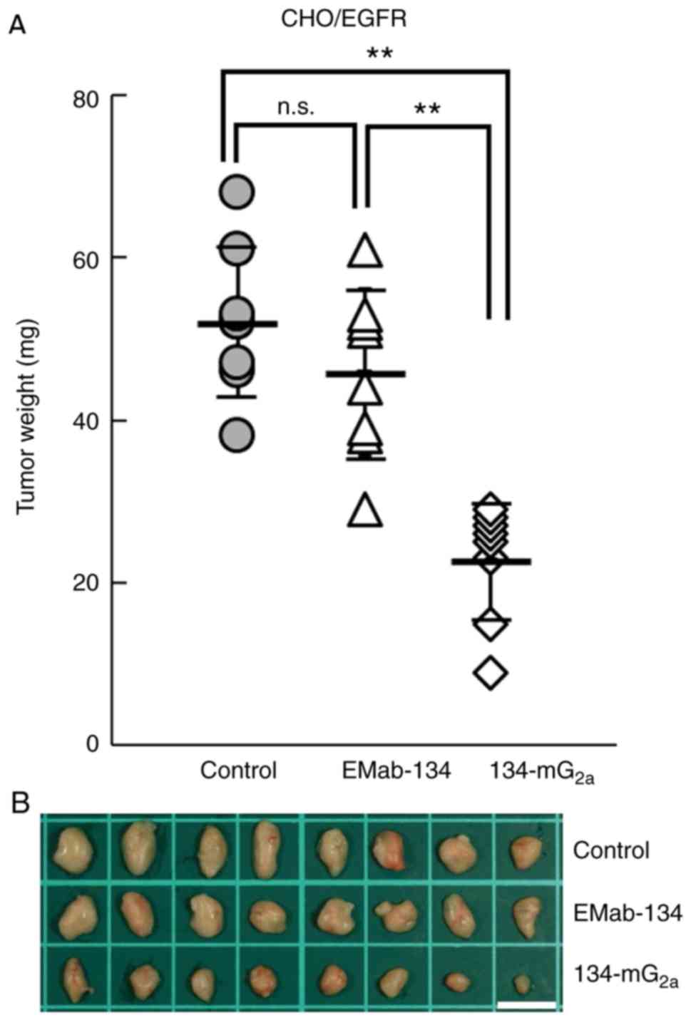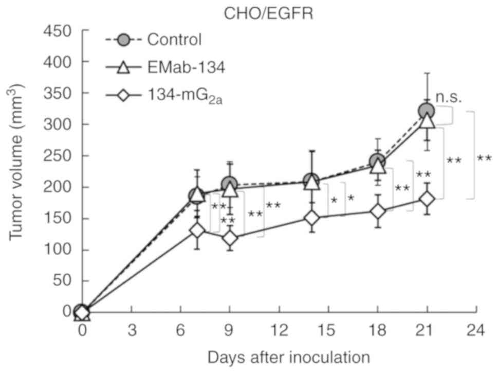 A total of 24 female BALB/c nude mice (5 weeks old, weighing 14-17 g) were purchased from Charles River Laboratories, Inc. and used in experiments once they reached 7 weeks of age. CHO/EGFR cells (0.3 ml of 1.33×108 cells/ml in DMEM) were mixed with 0.5 ml BD Matrigel Matrix Growth Factor Reduced (BD Biosciences); 100 µl of this suspension (5×106 cells) was injected subcutaneously into the left flanks of the mice. On day 1 post-inoculation, 100 µg of EMab-134 (n=8), 134-mG2a (n=8), or control mouse IgG (n=8) in 100 µl PBS were injected intraperitoneally. Additional antibody inoculations were performed on days 7 and 14. At 21 days following cell implantation, all mice were euthanized by cervical dislocation; tumor diameters and volumes were determined as previously described (21).