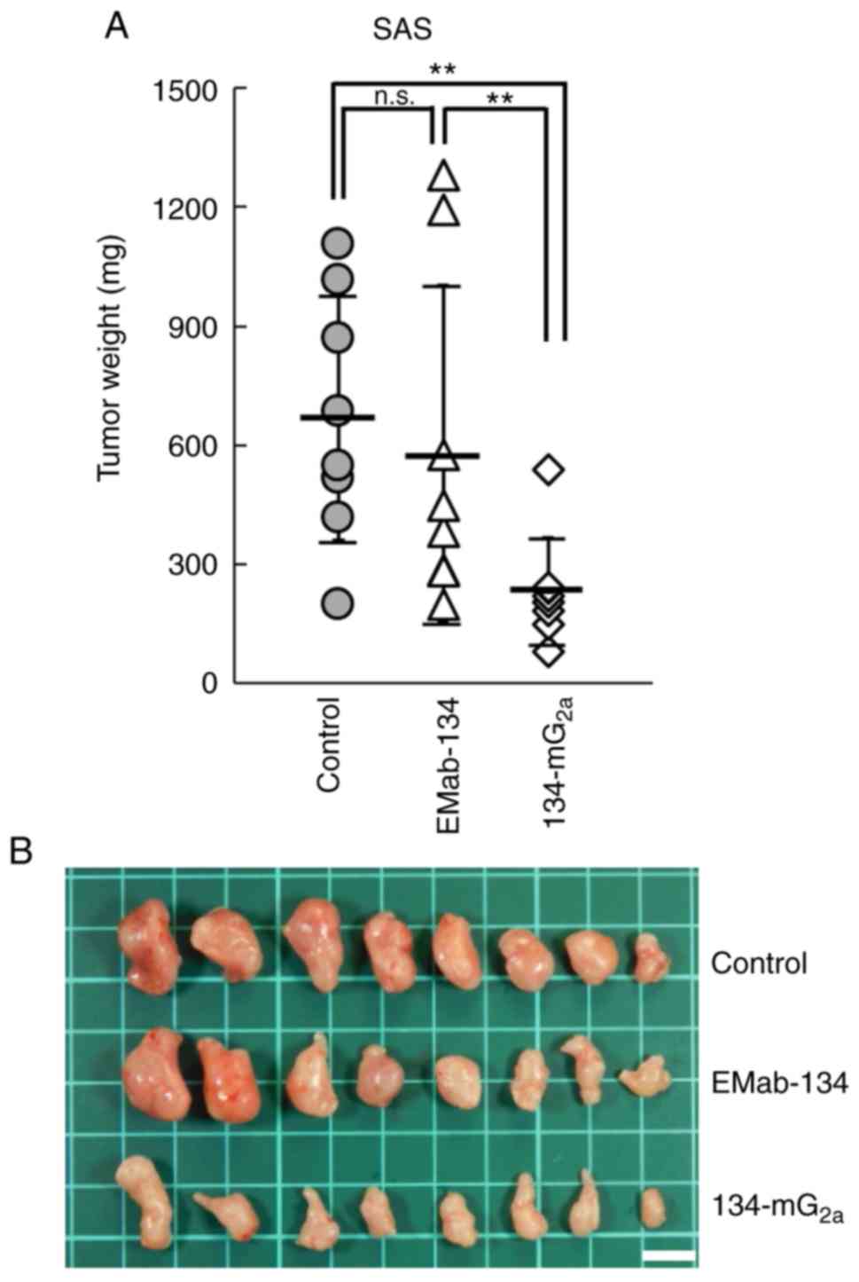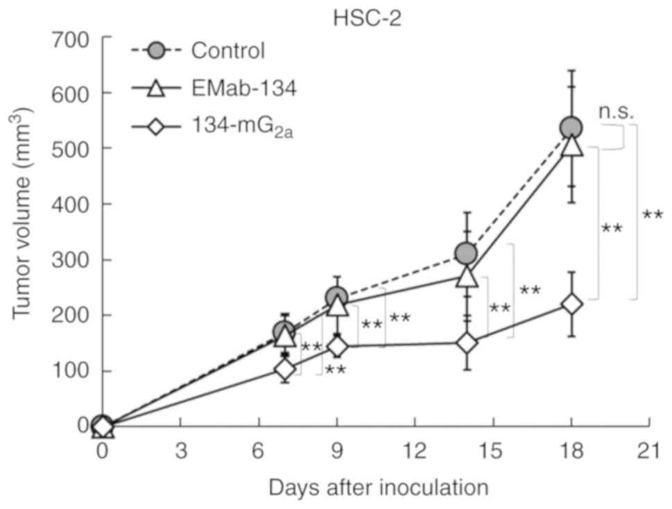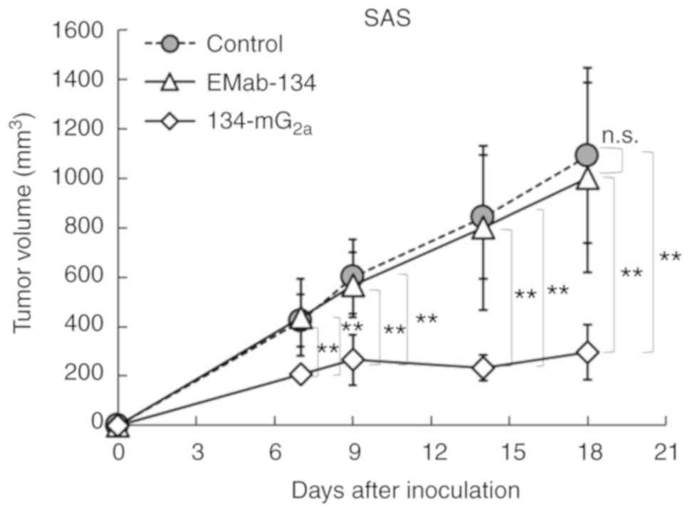 A total of 48 female BALB/c nude mice (5 weeks old, weighing 14-17 g) were purchased from Charles River Laboratories, Inc. and used in experiments once they reached 7 weeks of age. The HSC-2 and SAS cells (0.3 ml of 1.33×108 cells/ml in DMEM) were mixed with 0.5 ml BD Matrigel Matrix Growth Factor Reduced (BD Biosciences); 100 µl of this suspension (5×106 cells) was injected subcutaneously into the left flanks of the mice. On day 1 post-inoculation, 100 µg of EMab-134 (n=8 in each group), 134-mG2a (n=8 in each group), or control mouse IgG (n=8 in each group) in 100 µl PBS were injected intraperitoneally. Additional antibody inoculations were performed on days 7 and 14. At 18 days following cell implantation, all mice were euthanized by cervical dislocation, and tumor diameters and volumes were determined.