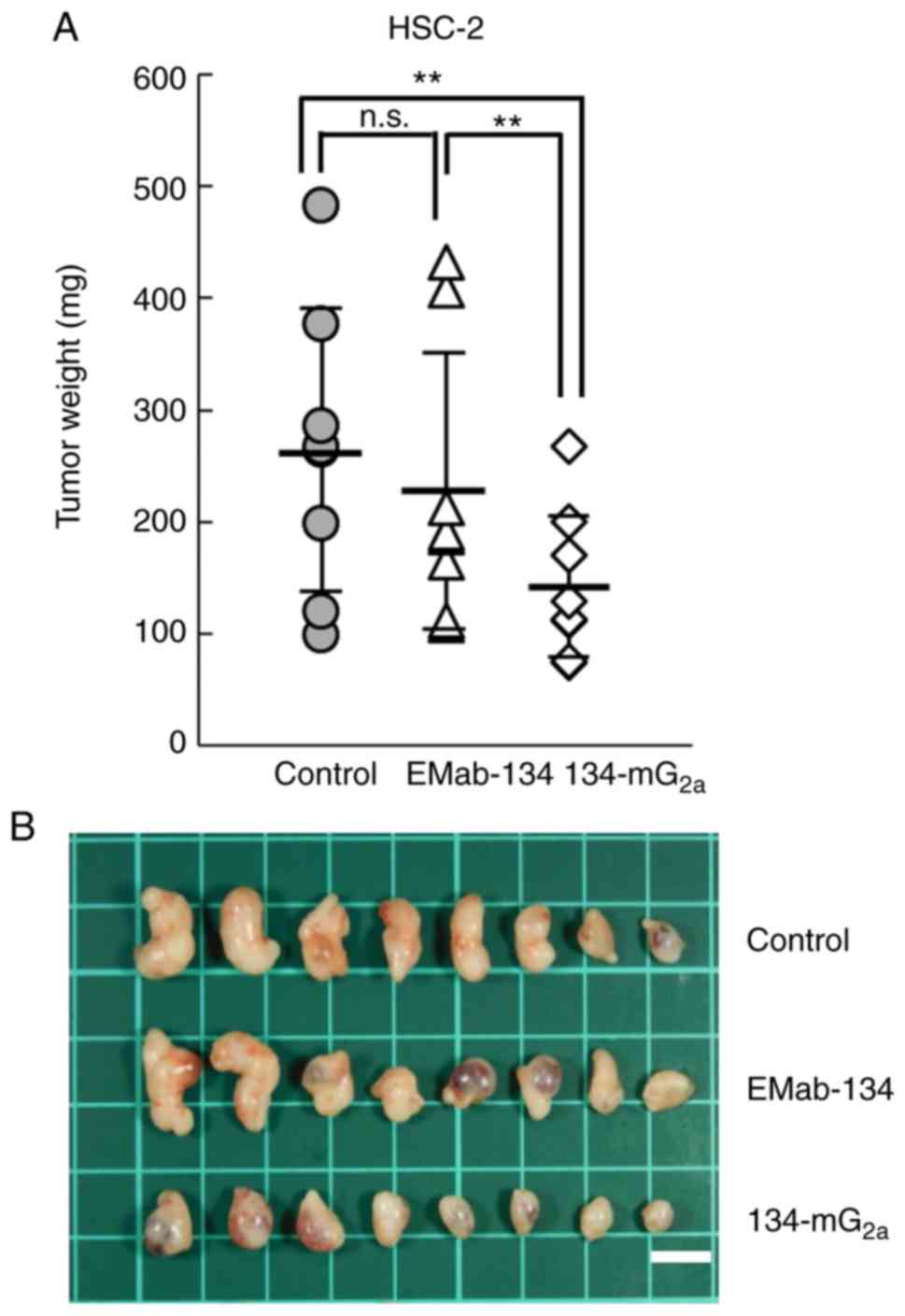 In the HSC-2 xenograft models, 134-mG2a (100 µg), EMab-134 (100 µg), or control mouse IgG (100 µg) were injected intraperitoneally into mice on days 1, 7 and 14 after the HSC-2 cell injections. Tumor volume was measured on days 7, 9, 14 and 18. The administration of 134-mG2a resulted in significantly decreased tumor development on days 7 (P<0.01), 9 (P<0.01), 14 (P<0.01) and 18 (P<0.01) in comparison to the EMab-134-treated mice (Fig. 9). No significant differences were observed between the EMab-134- and control IgG-treated mice on days 7, 9, 14 and 18. The administration of 134-mG2a resulted in a 57% reduction in tumor volume compared to the EMab-134-treated mice on day 18 post-injection. Tumors from the 134-mG2a-treated mice weighed significantly less than the tumors from the EMab-134-treated mice (37% reduction; P<0.01, Fig. 10A). No significant differences in tumor weight were observed when comparing those from the EMab-134- and control mouse IgG-treated mice. Tumors resected on day 18 are illustrated in Fig. 10B. Total body weights did not differ significantly among the 3 groups (data not shown). These results indicated that the administration of 134-mG2a effectively limited the growth of HSC-2 cell xenografts.