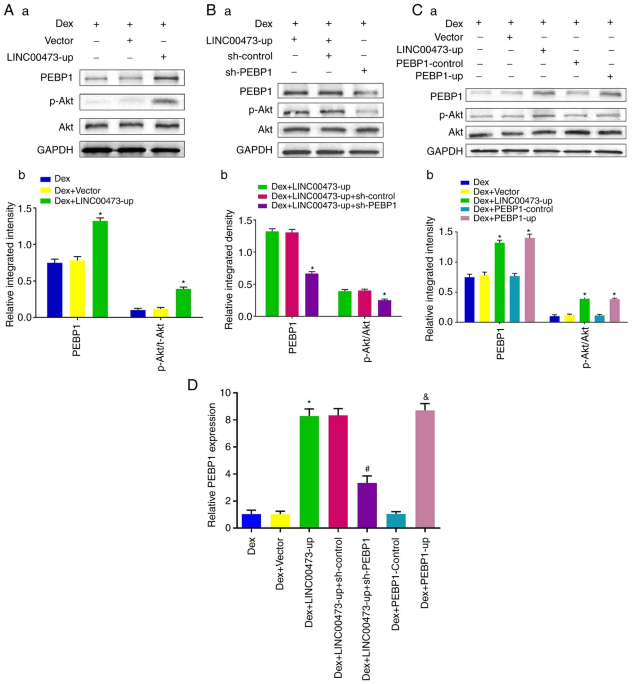 In addition, MK-2206 (Selleckchem), an Akt inhibitor, and SC79 (Selleckchem), an Akt activator, were used in the antagonist and activation experiments, respectively. Cells in the Dex + LINC00473-up group were treated with MK-2206 (5 µmol/l) to create the Dex + LINC00473-up + MK-2206 group (Dex + LINC00473-up + MK-2206), while cells in the Dex group were treated with SC79 (8 µg/ml) to create the Dex + SC79 group (Dex + SC79).