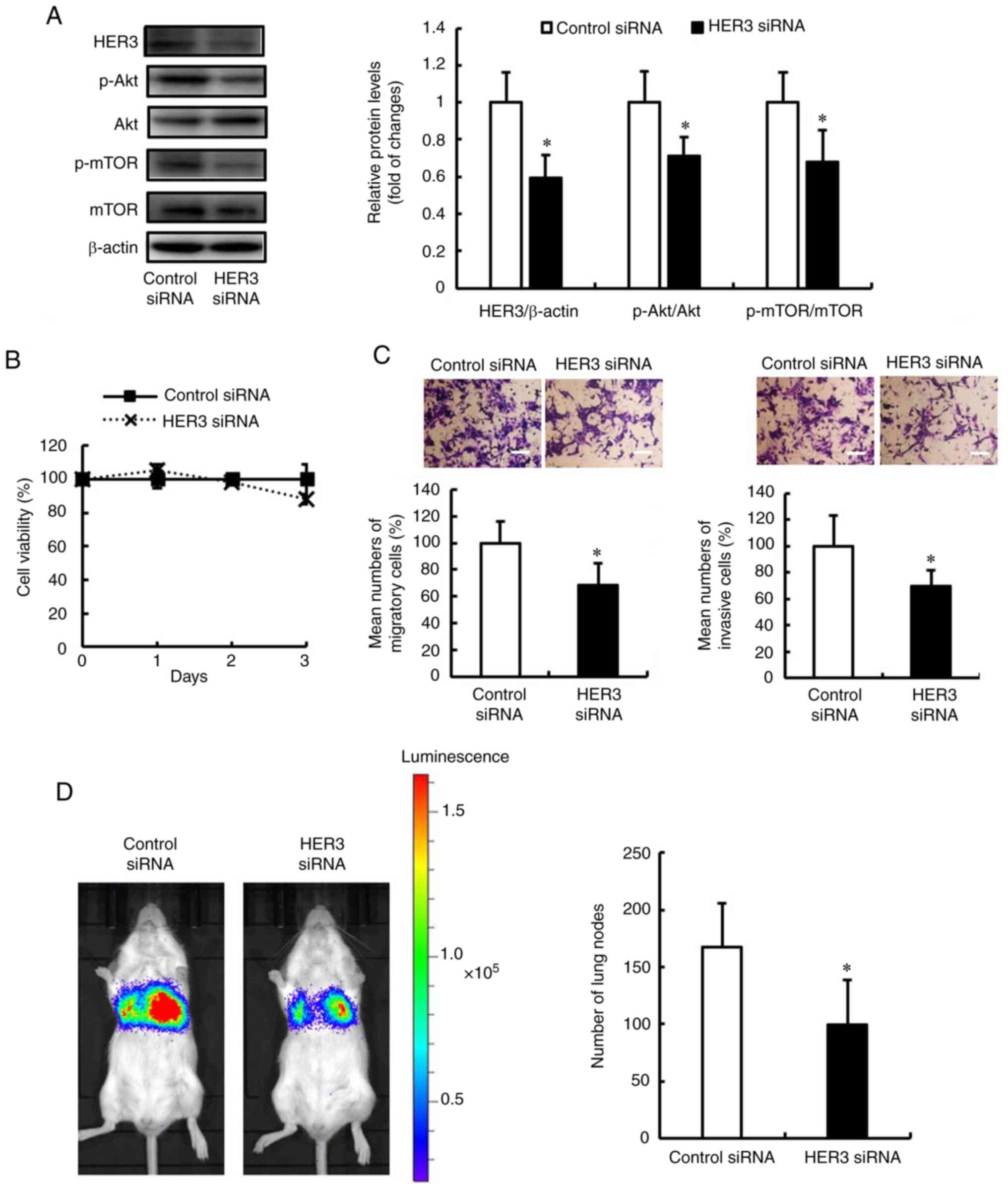 To determine whether HER3 serves as a useful therapeutic target for TNBC metastasis, the migration, invasion and metastasis of TNBC cells were examined when HER3 was silenced using siRNA. The efficacy of HER3 siRNA was first confirmed on the expression of HER3/Akt/mTOR and the viability of 4T1-L8 cells. It was confirmed that HER3 siRNA decreased the expression of HER3, downstream p-Akt, and that of p-mTOR in 4T1-L8 cells (Fig. 2A). In addition, HER3 siRNA inhibited the migration and invasion of 4T1-L8 cells, although it did not affect their viability (Fig. 2B and C). To validate the anti-metastatic activity of HER3 siRNA, the number of metastatic nodules were counted in the lungs of the mice. Treatment with HER3 siRNA reduced the number of lung metastatic nodules compared with those in the group without HER3 siRNA treatment (Fig. 2D). These results suggest that the HER3/Akt/mTOR pathway serves as a therapeutic target for TNBC metastasis.