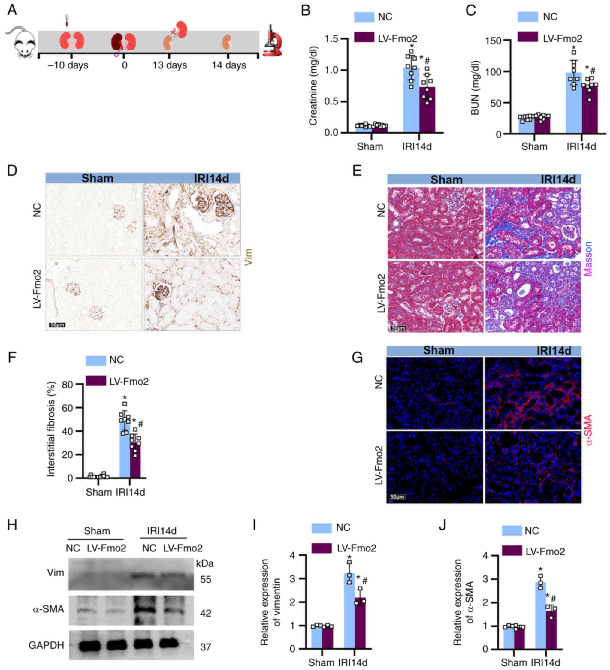 To examine the impact of FMO2 on renal fibrosis following ischemia-reperfusion, the mice were injected with LV vectors containing LV-FMO2 or an NC into the kidney 10 days prior to unilateral left renal ischemia. The mice underwent 28 min of continuous ischemia, followed by unilateral right nephrectomy on the 13th day following reperfusion, and were euthanized on the 14th day (Fig. 3A). Following the removal of the right kidney, the levels of blood urea nitrogen and serum creatinine increased (Fig. 3B and C). Staining for vimentin (Fig. 3D), Masson's trichrome (Fig. 3E) and α-SMA (Fig. 3G) revealed significant ECM deposition in the renal tubulointerstitium on the 14th day following ischemia-reperfusion treatment (Fig. 3F). Furthermore, western blot analysis of and expression in the mouse kidneys (Fig. 3H-J) confirmed that overexpression of FMO2 attenuated renal dysfunction and fibrosis induced by IRI.