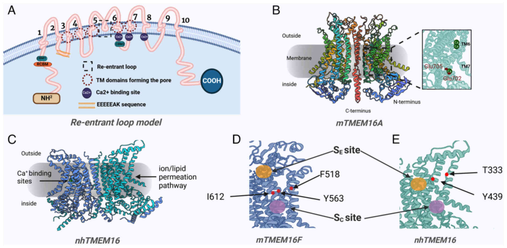 The Cl− channels present in mammalian cells can be divided into the following five categories: Cystic fibrosis transmembrane conductance regulator (CFTR), Ca2+-activated Cl− channels (CaCCs), ligand-gated Cl− channels, volume-regulated Cl− channels and voltage-gated Cl− channels (1). The TMEM16 proteins are Cl− channels that can reveal one or more regulatory mechanism, ensuring the normal functioning of molecules or compounds in an organism through their protein typing (2). At present, 10 subtypes of TMEM16 proteins have been identified, which play a role in various functions of the human body (3). Certain members, such as TMEM16A and B, serve as CaCCs and as phospholipid scramblases, thereby demonstrating the dual functions of channels and scramblases, with others performing other cellular functions (4). Transfection of other TMEM16 proteins (such as 16C, 16F, 16G, 16H, 16J and 16K) into null cells does not result in increased anion transport or membrane current, indicating that these proteins have other cellular functions (4). For instance, research has shown that TMEM16J (anostatin-9) exhibits activity as a cAMP/PKA activated channel (5). The TMEM16 proteins are activated by the Gq protein-coupled receptor, mutations of which lead to cellular dysfunction (6). The TMEM16 proteins link Ca2+ signals with cellular electrical activity and lipid transport and play a critical role in the manifestation and proliferation of various human diseases, including cystic fibrosis (CF), jaw dysplasia, nephrolithiasis, myotonia congenita and cancer (7). Therefore, fully understanding the structures and functions of the TMEM16 proteins, unraveling the mechanisms underlying their involvement in complex molecular transport and ascertaining their potential as targets for the design of drugs for the treatment of human diseases are major avenues of pursued research.