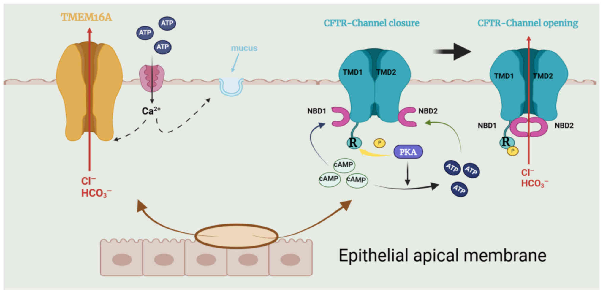 CFTR, a transmembrane conductance regulator protein with 1,480 amino acids, is a Cl− channel driven by cAMP (64) and is located in the apical membrane of secretory epithelial cells. CFTR can transport both Cl− and HCO3− into epithelial cells. The channel is an ATP-binding transporter comprising five domains: Two transmembrane domains that form the channel pore, a regulatory domain (R) and two nucleotide-binding domains (NBD1/NBD2) (69). High levels of Cl− are necessary for the important physiological actions of CFTR in the epithelial cells of the airways, including moistening the mucosal surface and removing the mucosal cilia (63,69). Patients with CF lack CFTR, which causes mucus aggregation and tracheal blockage and leads to susceptibility to chronic bacterial infections (63). These patients are therefore at risk of respiratory diseases. In addition, these airway epithelial cells also express TMEM16A, which functions as a second Cl− channel; the cytosolic Ca2+ concentrations control its activity, and several inhibitors or agonists have been identified (69) (Fig. 3).
