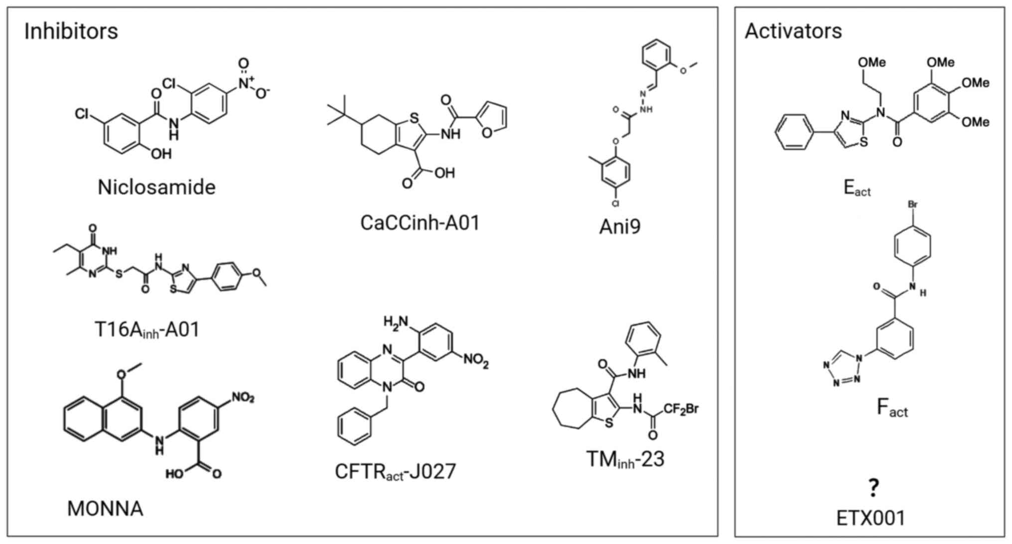 The known modulators of TMEM16A, including CACCinh-A01, Fact, Eact, MONNA, TMinh-23, T16inh-A01, ETX001, Ani9 and phenyl quinoxalinone (CFTRact-J027) are either inhibitors or activators (Fig. 4) (77). Phenyl quinoxalinone is used to treat conditions such as constipation, dry eyes, cholestatic liver and inflammatory lung diseases; it is a highly effective modulator of CF and can thus change its course and progression (77). This type of CFTR-modulating drugs are potential candidates for use in novel therapeutic methods of CF (77). They can enhance the expression of the mutated gene in the G551D-CFTR mutant to the original functional level and even restore it to the pre-mutation state (66). Notably, TMEM16A may demonstrate functions in addition to the secretion of electrolytes and mucus and further engage in the proliferation of basal cells and the repair mechanisms of epithelial cells (78,79).
