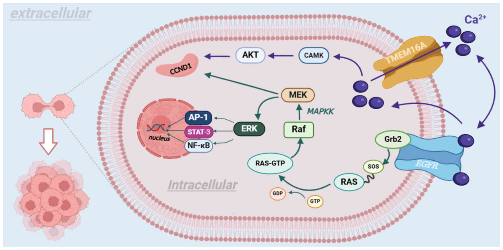 TMEM16A, in conjunction with EGFR, mediates the growth of tumors through two routes. First, as a CaCC, TMEM16A promotes the expression of cyclin D1 (CCND1) via the CAMK and AKT signaling pathways in succession, thereby leading to tumor proliferation (103). Second, TMEM16A participates in cancer proliferation and migration by influencing the MAPK and CAMK signaling pathways. Subsequently, the MAPK signaling pathway activates the MAPKK signaling pathway, which binds to the Grb2 binding site on EGFR with son of sevenless protein on Ras protein, altering the synthesis and activation of the Raf protein, which subsequently activates CCND1 via the phosphorylation of MEK (104). Furthermore, activation of the MAPKK signaling pathway promotes angiogenesis in vascular endothelial cells (104). As EGFR regulates the expression levels of tumor-associated genes, different signaling pathways mediate the development of several types of cancer (105-107). For instance, the development of glioma is mediated by activation of the NF-κB signaling pathway (108,109) and HNSCC is mediated by the Ras/Raf/MEK/ERK1/2 signaling pathway (110). Another set of signaling pathways, p38 and ERK1/2, are associated with promoting hepatocarcinogenesis (Fig. 5) (111).